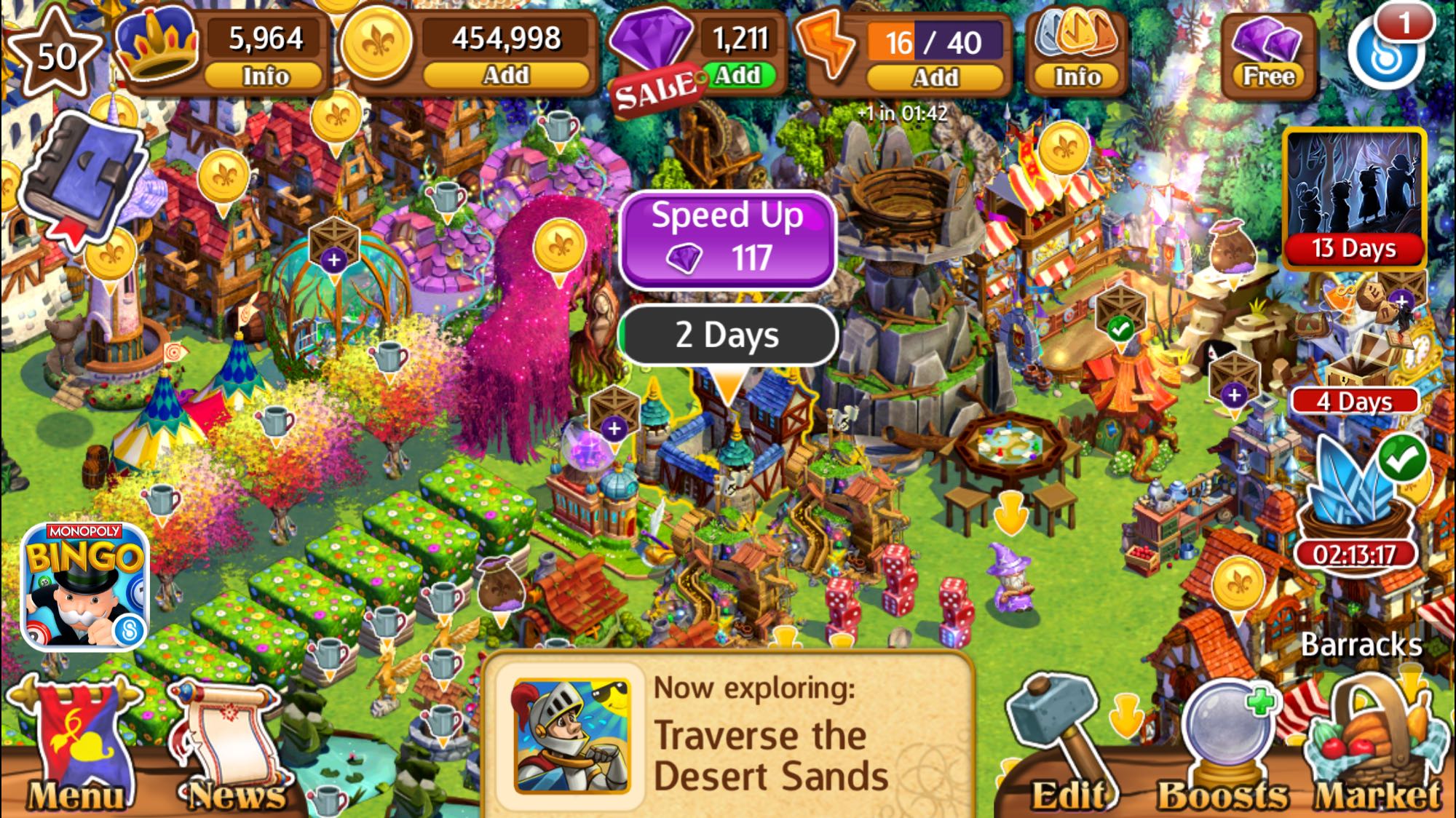 2个城堡!主城堡探险22小时出8钻,另一个城堡同样探险任务44小时8钻、兵营一样44小时8钻,橙色龙出1-5钻看运气、探险任务需要蛋糕🎂从两个餐桌、牛头怪、蛋糕屋得到、或者在3个厨房做出来!以上收获8钻石全部都要开飞行模式刷出来!