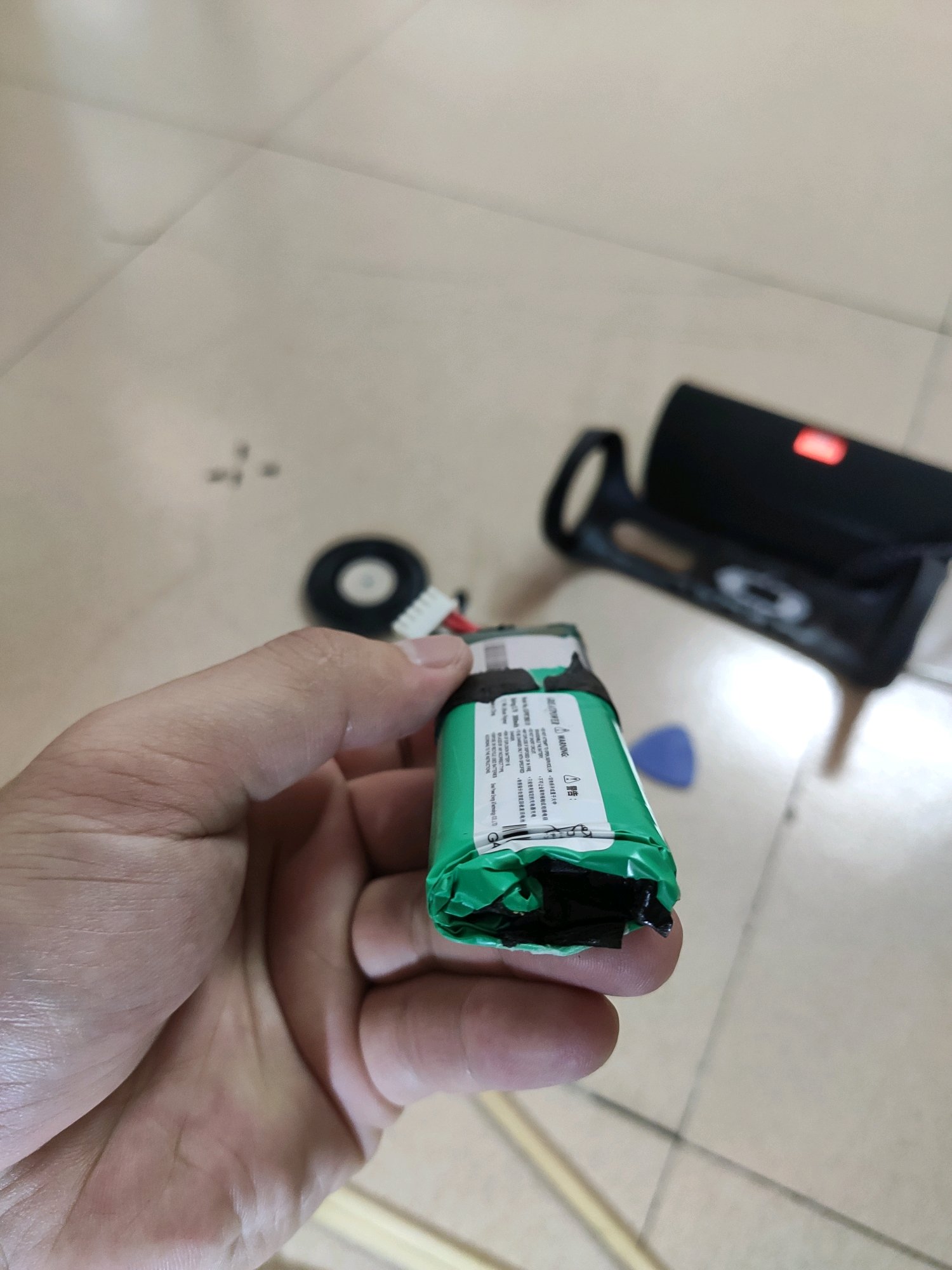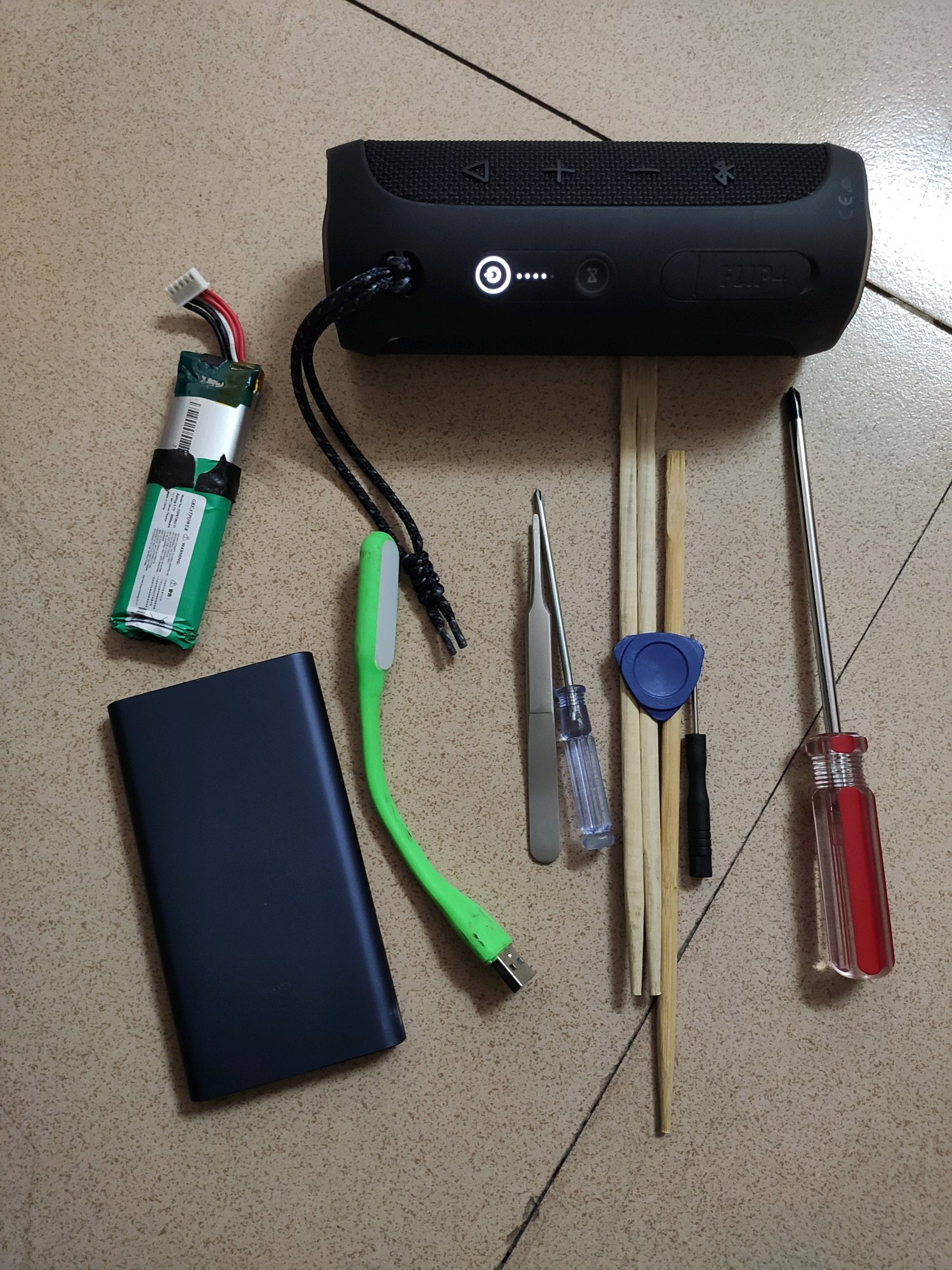 JBL FLIP4 使用一年 电池逐渐不行,于是在某宝淘了一块电池,自行更换。可真的没想到那么难换,电池鼓包 拿都拿不出来 我坐在地上思考了良久 该怎么把电池弄下来,想到了用筷子捅出来,所以就开始动手。如图二 先得看到电池尾端 就把充电口给拆了 需要全部线拔开 看到了电池尾端。图三图四,用筷子头对准电池尾端,筷子尖对着地下慢慢敲 一定记着是要筷子头对着尾端 不然尖的很容易导致电池炸,需要看着电池上升部位 哪里少就敲哪里 一定得慢 不然里面很多电子元件 很容易烂掉,加上电池原因 怕爆炸。所以得慢,电池上升一半了 就用手慢慢左右晃动 直到把电池拿出来。就是这步骤需要注意点(只针对电池鼓包用户)然后把新电池装进去 按照顺序把线插好,螺丝上进去 (记得线别插错,螺丝是每个地方的都不一样 所以你得区分好)也要记得千万千万别让螺丝给磁铁吸走了和螺丝刀别碰到两个音响 不然音质就不好了。。。整体来说 对于第一次拆机的我们,是有点难度,相信男同胞们不是什么问题 小心点就是了,慢慢来 细心点…对于JBL 整体做工没得挑剔 防水做的好 到处都是防水黑圈圈跟胶 非要吐槽就是电池盒做的太小了 电池鼓包难拿出来…最后的图就是我所用到的工具,