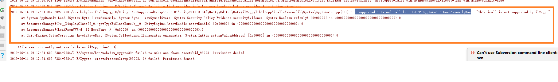 因为最近谷歌上传的包需要支持64位,所以我用unity2018导出安卓工程,测试运行的时候出现这个问题,我不知道是不是我使用IL2CPP功能导致无法加载assetbundle资源还是dll程序集