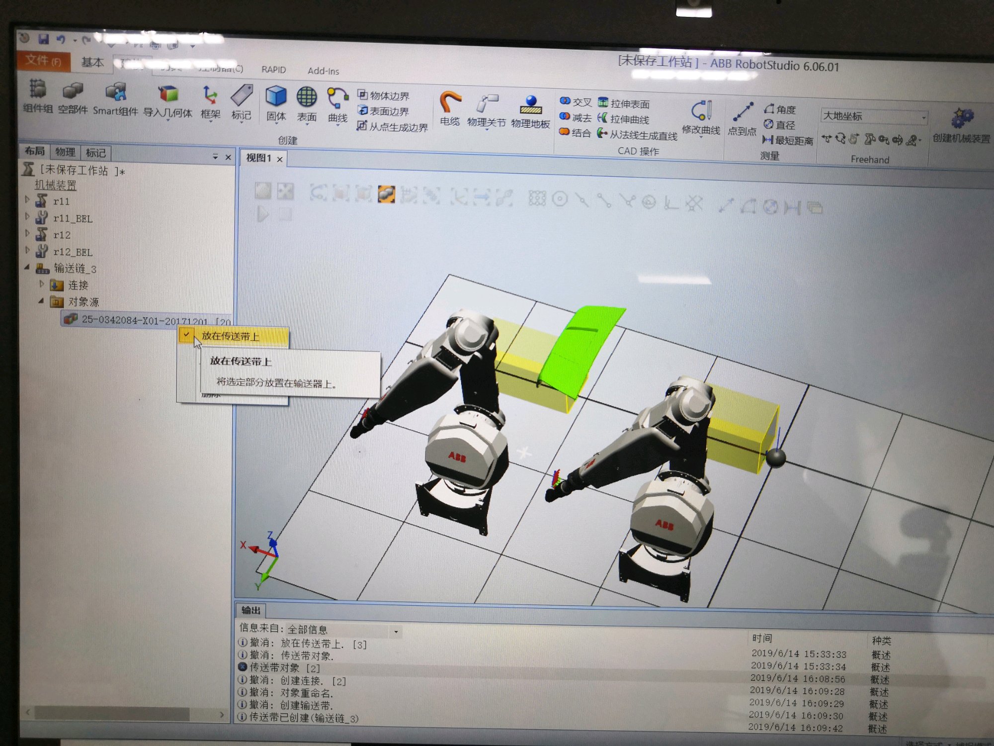 设置输送带,然后把对象源放在输送带上应该是在第一个机器人前端啊,我这放进去直接第二个上边了,哪位大佬看看啊