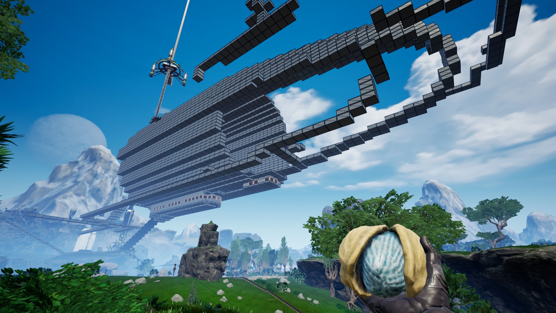 因为最大地基的尺寸是4*2,要当方块用就得放俩,水平方向的话1个地基就当1格还好算,垂直方向就得俩,光空艇头部的弧线我就尝试了无数次,建好了拆,拆了又建... 还得不停的搭梯子一会离远一点看看一会又换地方造...