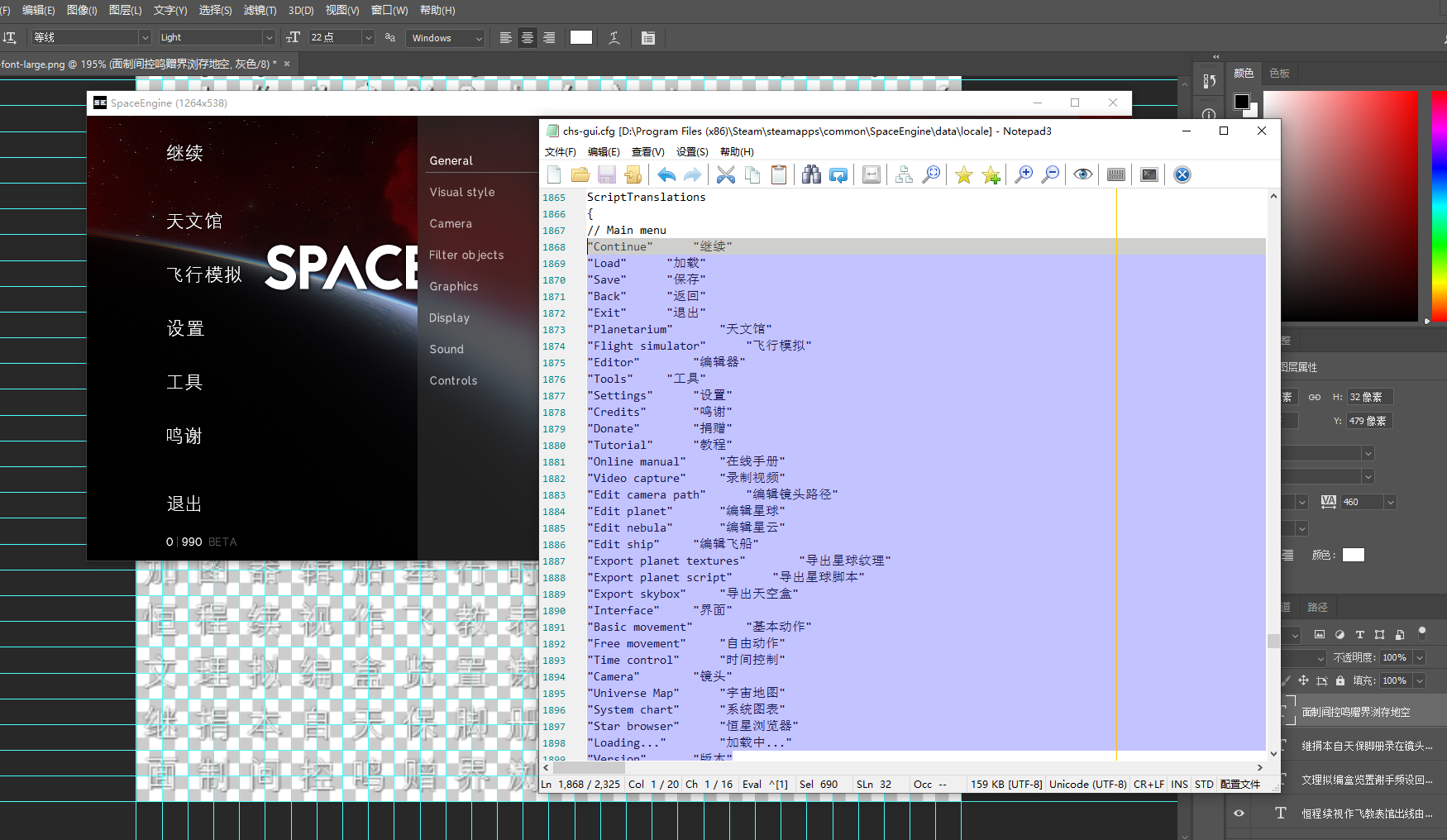 这个补丁只是增加了可显示的字符数,还不能完全解决中文显示问题,这是SE的文本渲染方式限制的。现在990还内置了一些教程,翻译这些教程会使可显示字符数变得更加紧张,我已经打算砍掉主菜单的大字体纹理来腾空间了。