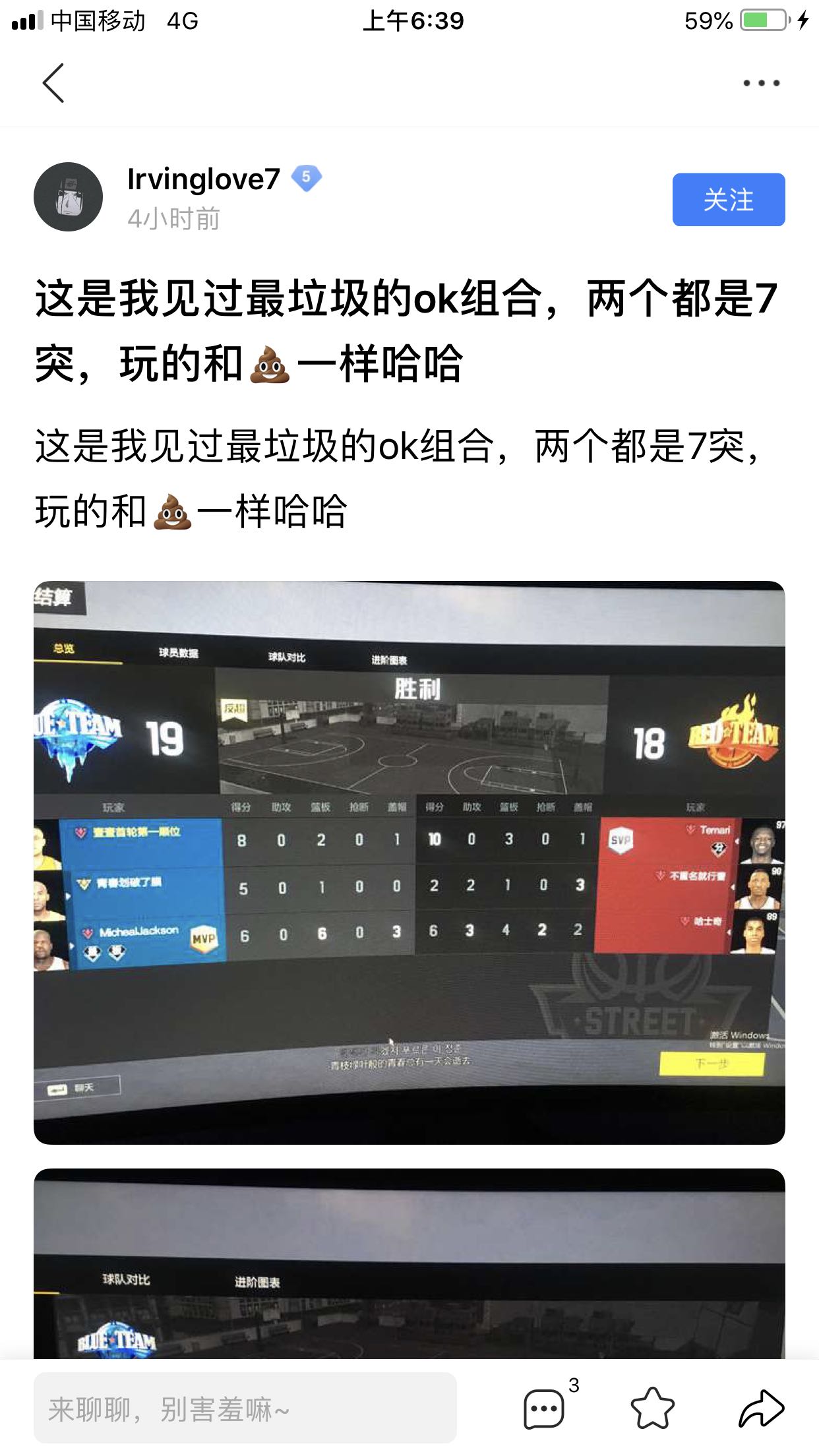 我和我朋友就是最垃圾的ok组合,我们输了我想对对手说你们很强,对跟我们的队友说对不起,但是!是不是我们必须每个球都进?每个篮板都能拿到?我们是在玩游戏玩游戏玩游戏重要的事情说三遍,我们是娱乐,怎么快乐怎么玩!不是分奴!别拿你的观念强加到我们身上可以不?