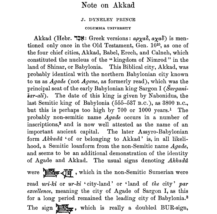 有幸找到一篇1906年的文章,作者:J.DYNELEY PRONCE。对阿卡德一词,进行讲解。需要注意的是,文章太老,存在一定的过时性。文中给出的楔形字形,应是…………20世纪初期与21世纪的楔形字形认知,可能略有不同。