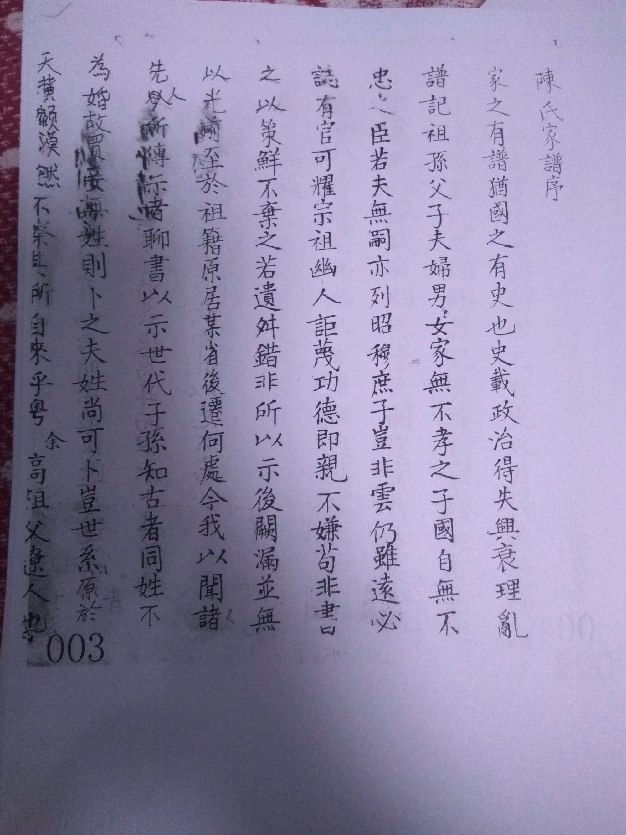 明末清初避兵乱,陈氏家族从辽阳塔湾迁移致辽阳八里庄,又迁移岳州,盖州,后定居在盖州近郊徐屯与暖泉两镇,后又有迁移至大石桥,到盖州至今已繁衍17辈 ,期间修家谱三次,最后一次是同治六年,至今150余年未有人再续宗谱,只因有家庙的存在,有族志的存在,人算不如天算,文革中家庙,族志俱毁,民国时期有心的族人手抄了两份家谱,使本支后人得以了解家族历史的来龙去脉,正是这本记录了11辈先祖的家谱使后世子孙连在一起,现已将这部家谱制成电子版,供有兴趣的族人查阅,家谱的信息很完备,包括名讳,字号,出生去世的年月日时辰,当过的官职,以及妻子出生去世日期和家庭信息女性族员出嫁的男方的地址,男方的父母,丈夫,兄弟和儿子的名讳,以及部分先祖的墓碑手绘图。并于嘉庆年间续编了20辈字辈:昌明永继世 文学克兴宗 启瑞维邦泰 天庭锡福隆。目前已到克字辈,在世的最高为明字辈,忘看到的族人,可以联系我。