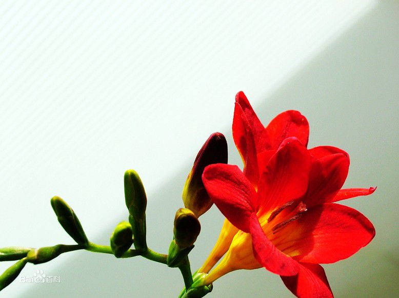 小苍兰又名香雪兰,为鸢尾科、香雪兰属植物。地下小球茎圆锥形,叶片剑形,叶丛中抽出穗状花序,每序有5朵至9朵小花着生在花序轴的上侧,直立向上,花冠为漏斗状,花色有白、黄、蓝、紫等色,花具芳香。可作为盆花点缀客厅、会议室等,也是冬季室内切花、瓶插花的材料。小苍兰属秋植球根花卉,秋萌芽,冬发育,春开花,夏休眠。生育期适宜的温度为白天18℃至20℃,夜间14℃至16℃。