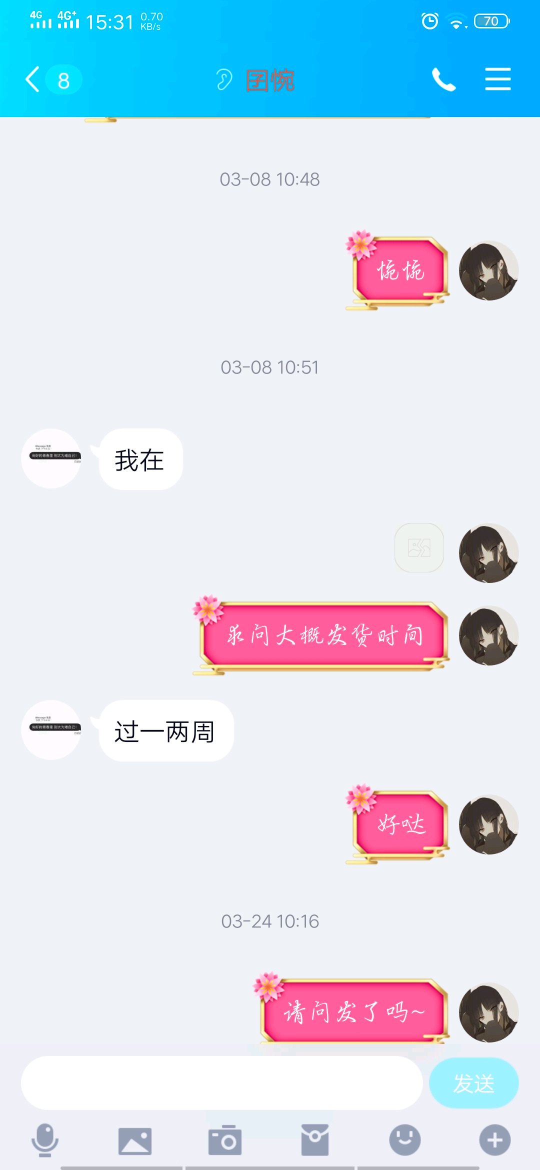 3.8问发货时间 结果要过一两周??您是出差了吗请问
