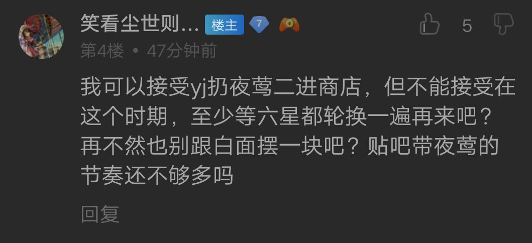 我可以接受yj扔夜莺二进商店,但不能接受在这个时期,至少等六星都轮换一遍再来吧?再不然也别跟白面摆一块吧?贴吧带夜莺的节奏还不够多吗
