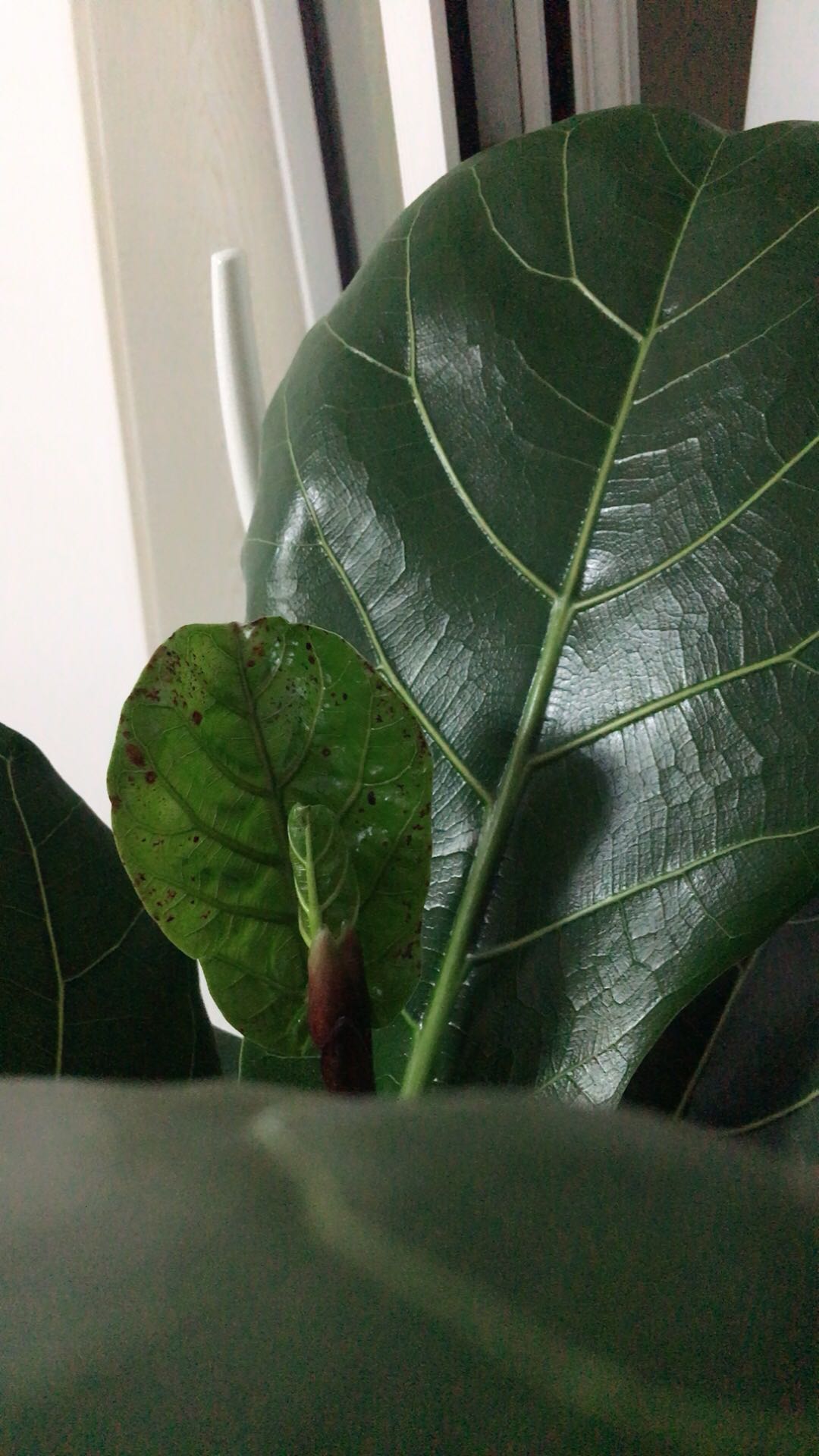 昨天擦了擦叶子上的尘土,手头没有椰子油和橄榄油就用了按摩精油