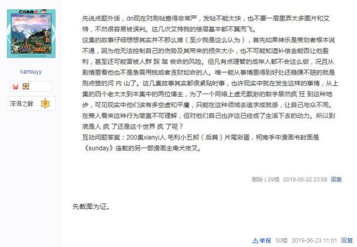 到目前为止,在一连串的事件中嫌疑最大的神乐,成为了少侦团所面对的第一位问讯者,虽然神乐想用几句无谓的陈述草草敷衍过去,不过在几位小朋友的眼中,他的嫌疑不降反升。不过谣言止于智者,通过问询剧团老板出羽和剧团成员们,柯南等人知道了所谓“神乐骗保图利”的传言,均是由最近在朋友圈爆红的河内山始发,这样的话,神乐的作案动机就被大大削弱了…