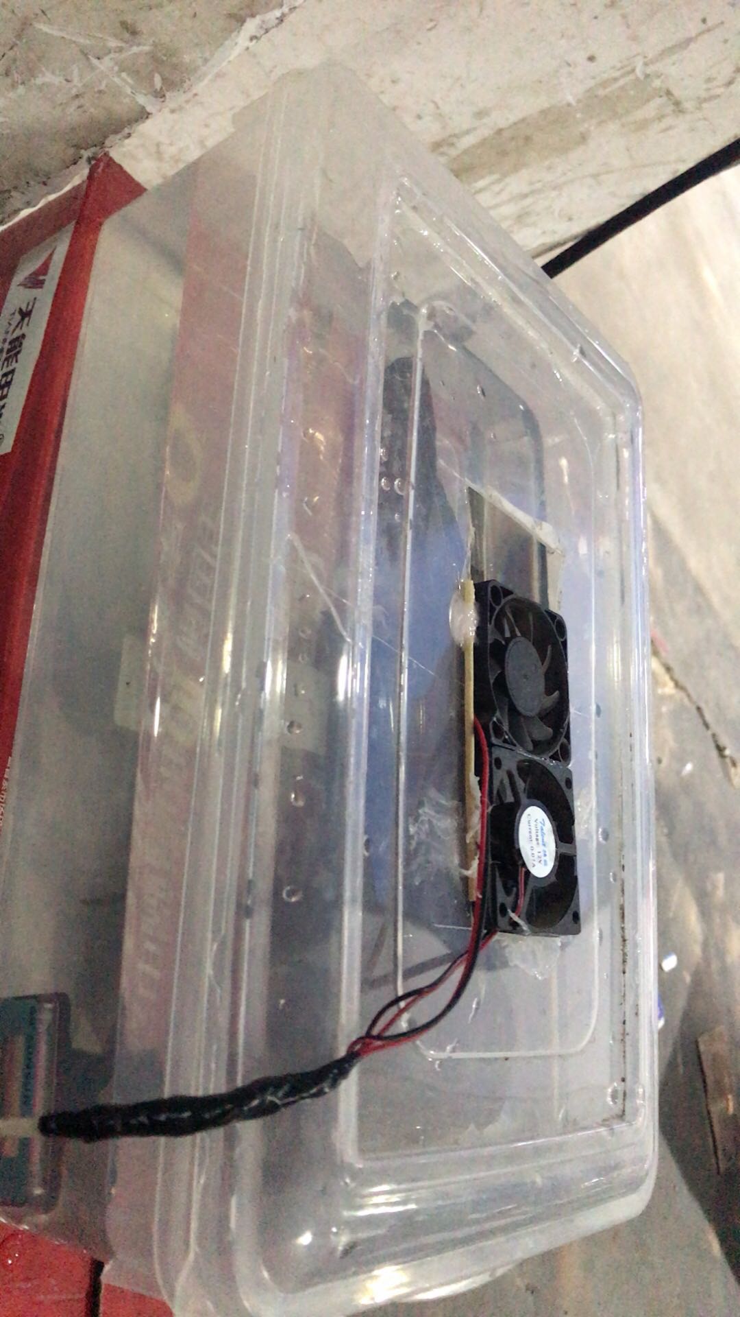 看好多人热死了龟 我也是今年刚入的新人 给你们看看 夏天我就用整理盒养 然后因为我搞电动车 在电动车充电器里面拆了两个风扇 cpu风扇也行 大概15元 箱子10块 usb插头和线 插头10块 线是之前坏的