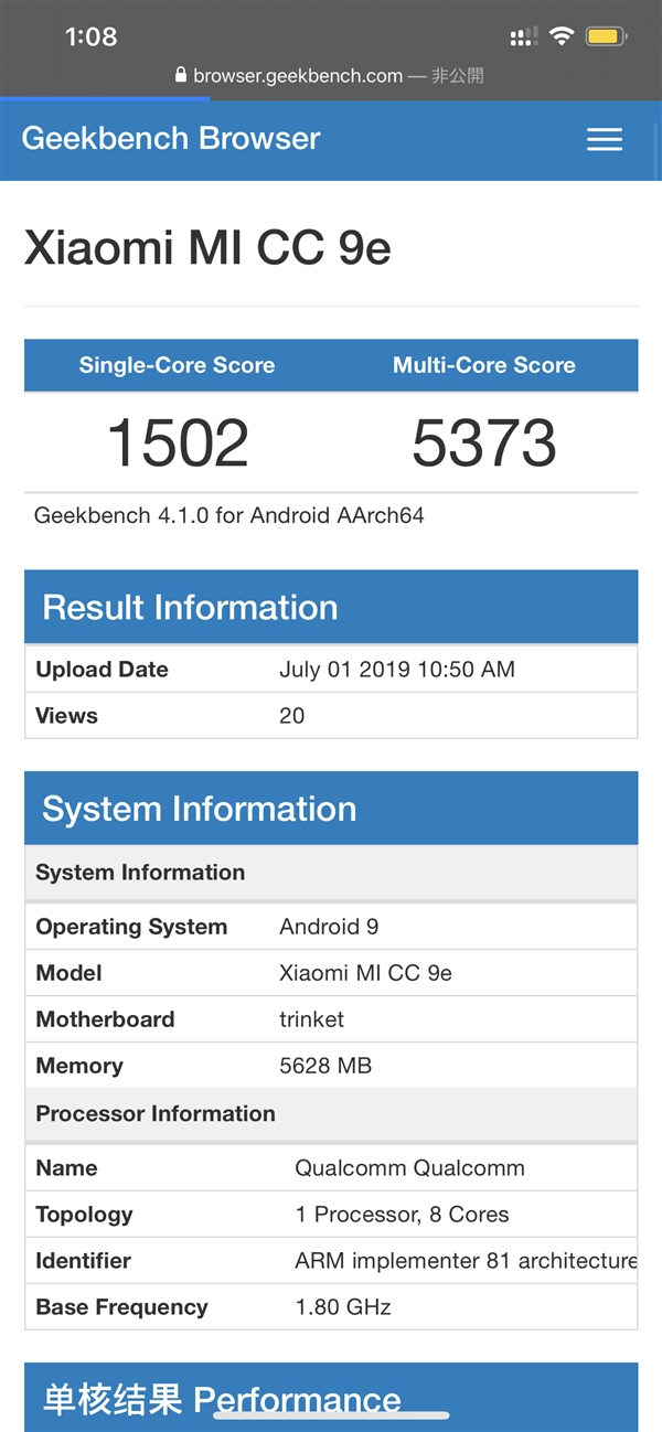 在此之前,小米CC9e已经现身GeekBench跑分网站,主板名称显示的trinket为骁龙665移动平台的代号,由此确定CC9e将首发骁龙665。