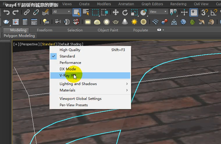 在“明暗处理”菜单中未显示“V-ray视口IPR”选项的情况下,运行“V-ray”菜单“注册”或转到“自定义>自定义用户界面…”>菜单>视图-着色Vewport Nitrous标签菜单,并从“操作”框中添加“V-Ray视口IPR”选项