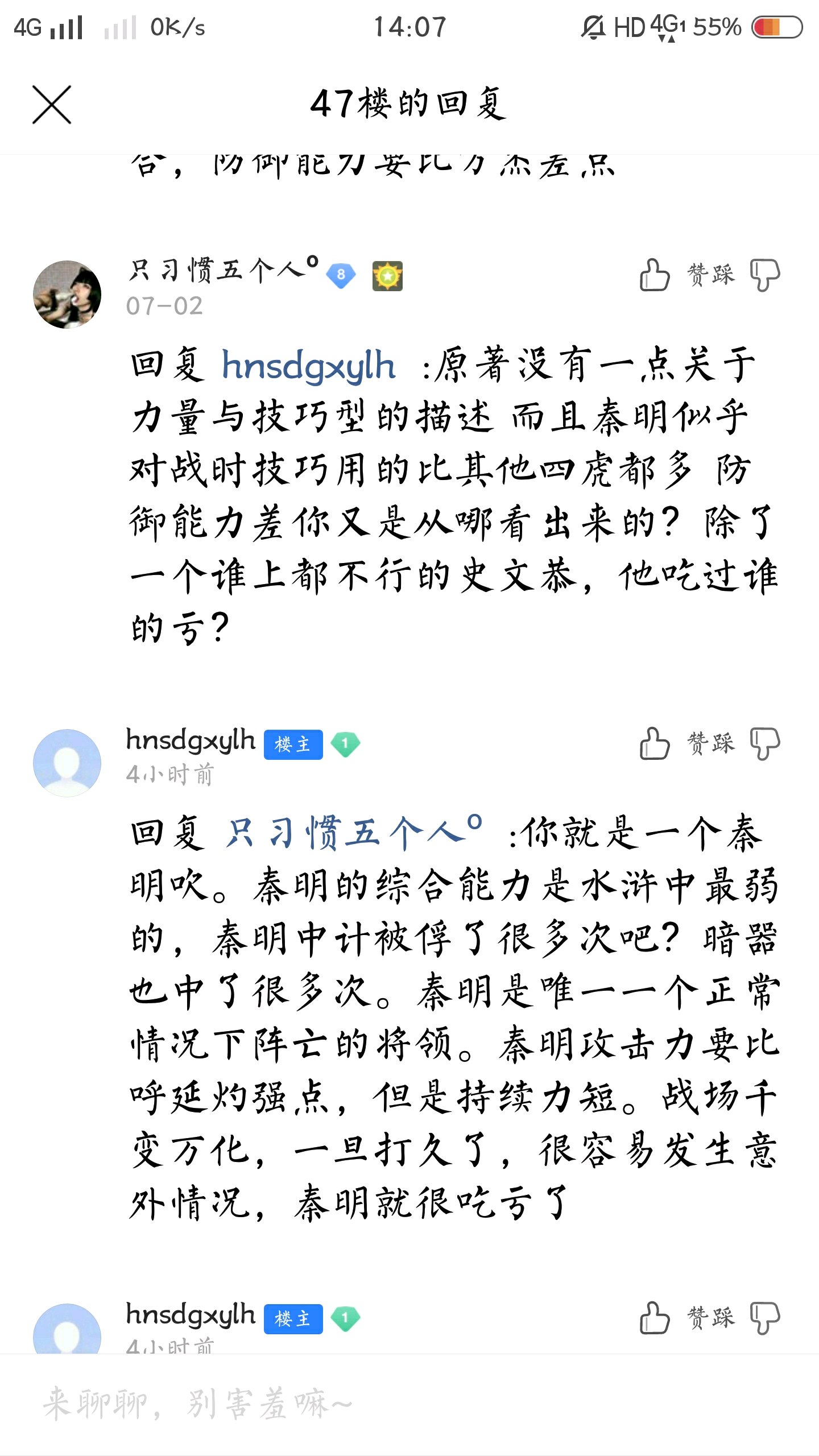 对啊这个人武评完全不拿原文当论据的,我都不记得秦明中过啥暗器,有也顶多一次 论证还都是莫明其妙的,直街断言能抗关花几回合就是比秦明强