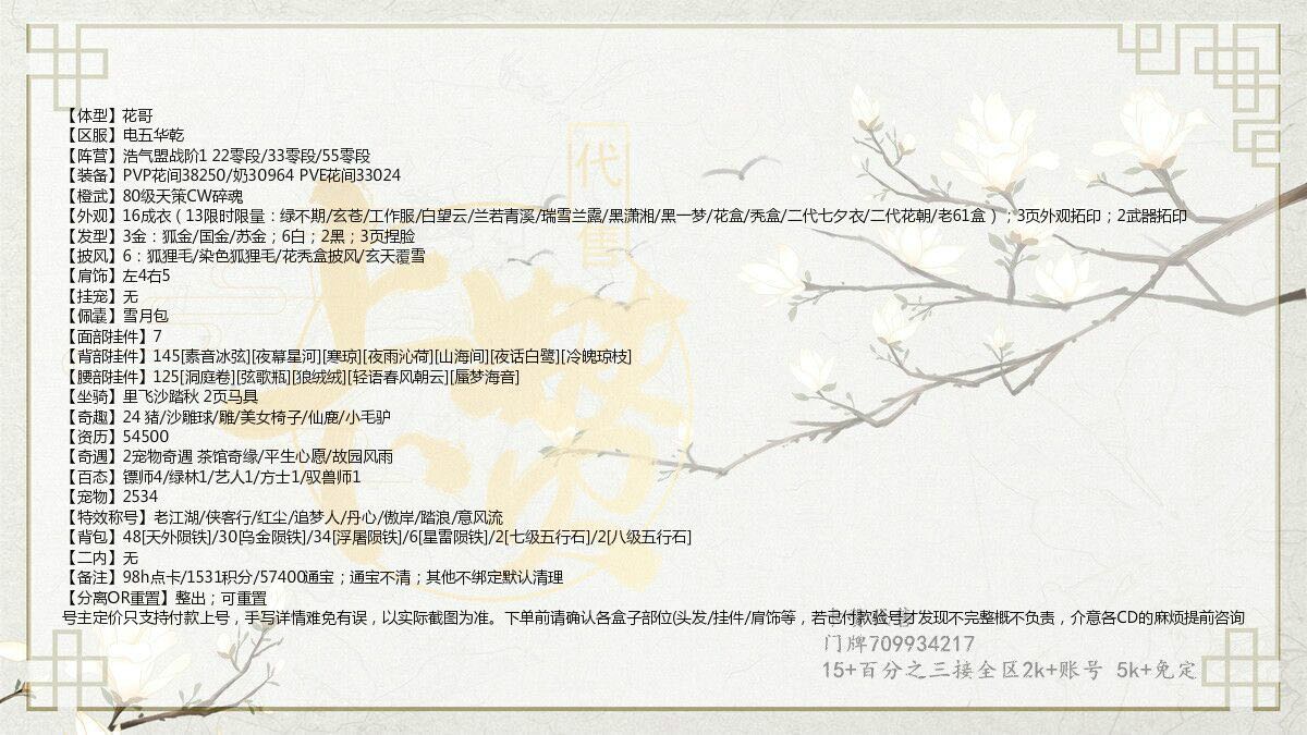 KA3405华乾花哥狐金/绿不期/玄苍/白望云/兰若青溪/瑞雪兰露/黑潇湘/黑一梦/花盒/秃盒/二代七夕衣/二代花朝/老61盒6披风双狐狸毛夜话5W4资历椅子JIO印可重置加570软通宝【6500】
