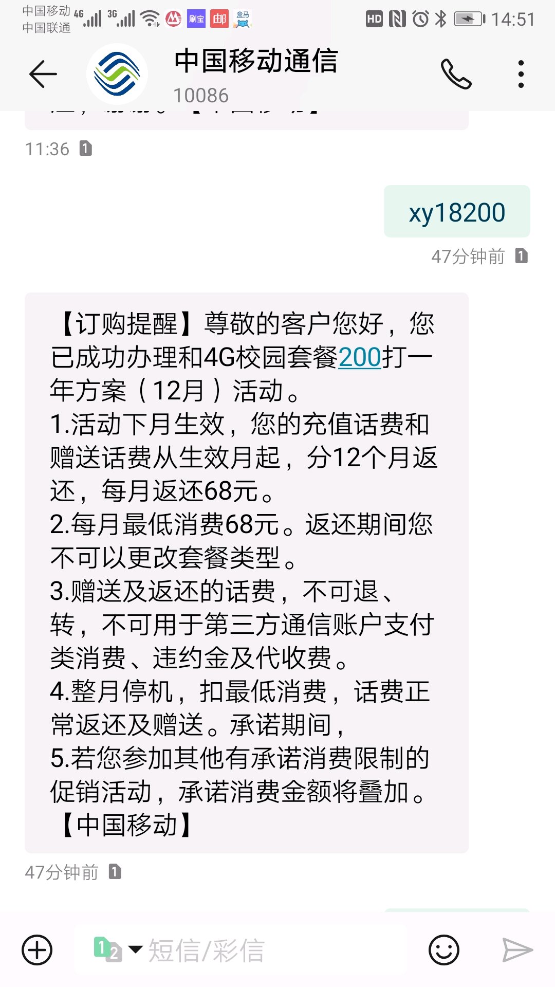 北京移动2018校园卡可以短信续约了。发送xy18200到10086 200打1年。