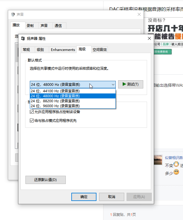 进电脑声音属性高级设置采样率多少 没有自动的设置 DAC就固定显示多少