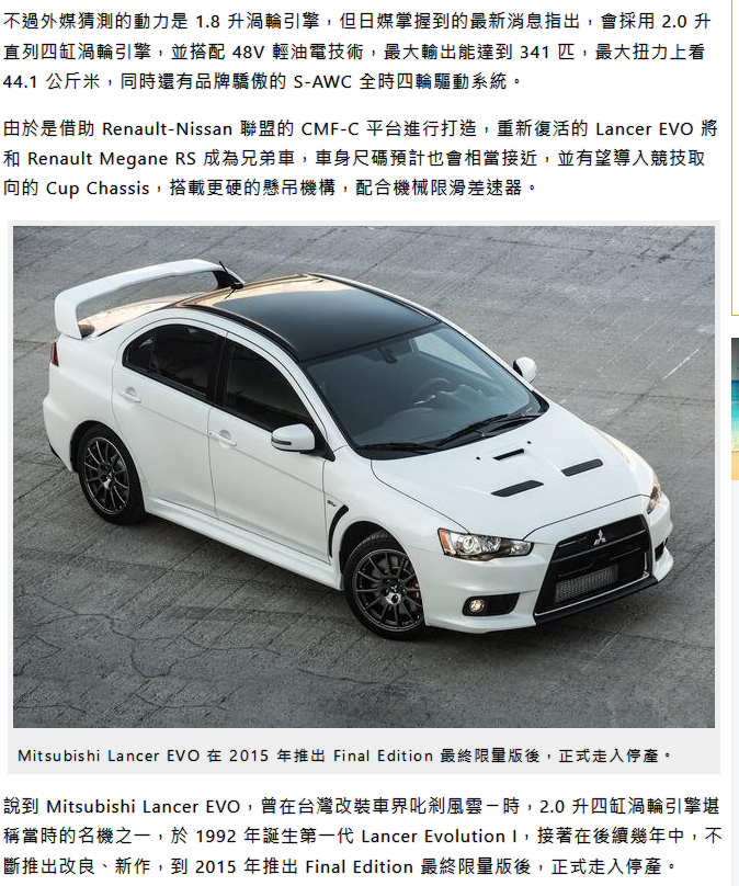 三菱 Lancer EVO 最新消息曝光,動力上看 341 匹!