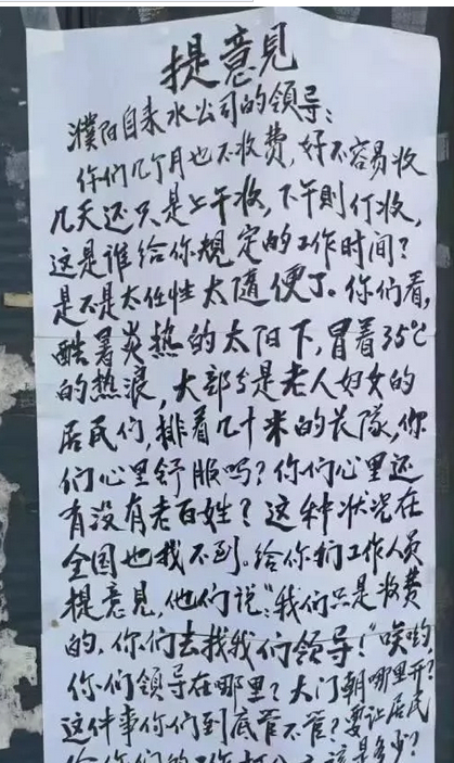 9日,上午收下午停,烈日下排长队,濮阳市自来水公司任性收费被市民贴“大字报”: