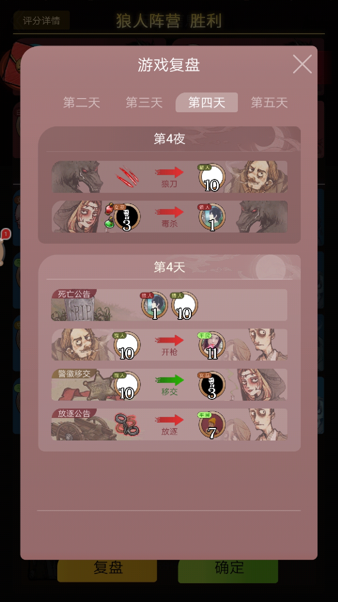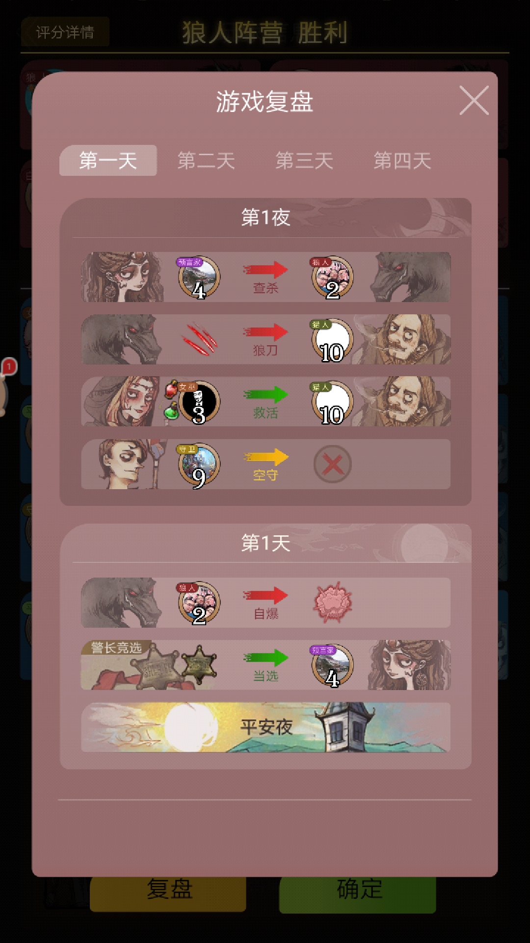 白狼王守卫局,用爱拯救ZZ队友。。。幸好我点刀守卫点的准,要不然血崩。4人警下,我没上警,警上1发言偏划,2被查杀,3发言强势,应该是女巫或者枪牌,4预言家,5警下白狼王,67俩破民互相发查杀,9警下,疑似盾牌,10,11警上发言很刚,强神或者民,拿不起盾,12警下,也可能是盾牌。另外真预警下选验一张9,所以第二晚刀9,不仅仅是奔着守卫也是让预言家发出无效查验为目标去刀,但是这白狼王宁可被放逐也不自爆,真是有点。。。。不过也圆了我第三天跳民,第四天跳盾来抗推外置位好人的逻辑(害怕被一直不出现的白狼王带走),最终在白狼王被放逐的前提下,逆转乾坤。