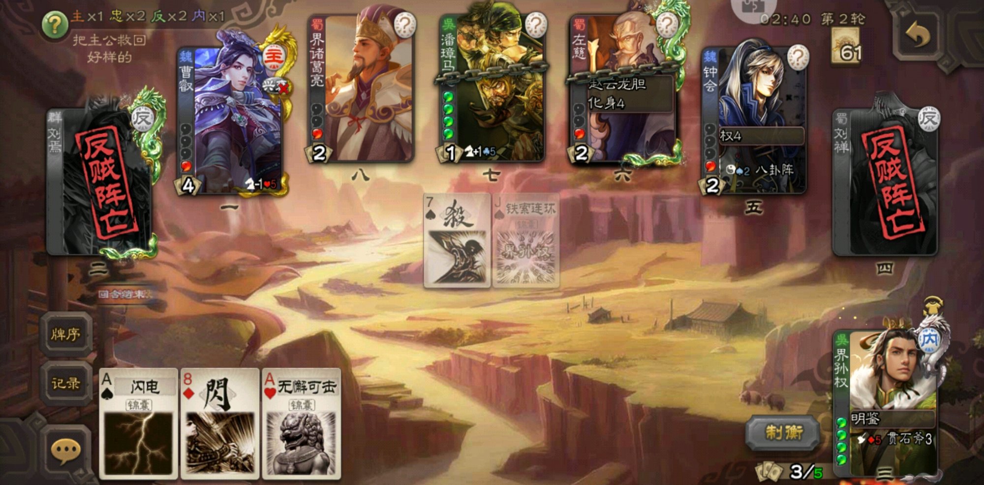 内奸开局跳忠,主公第二轮明鉴,我一波带走两个反,此时跳反除了撕票基本,索性装忠铁索两个反,下一轮钟会带走左慈