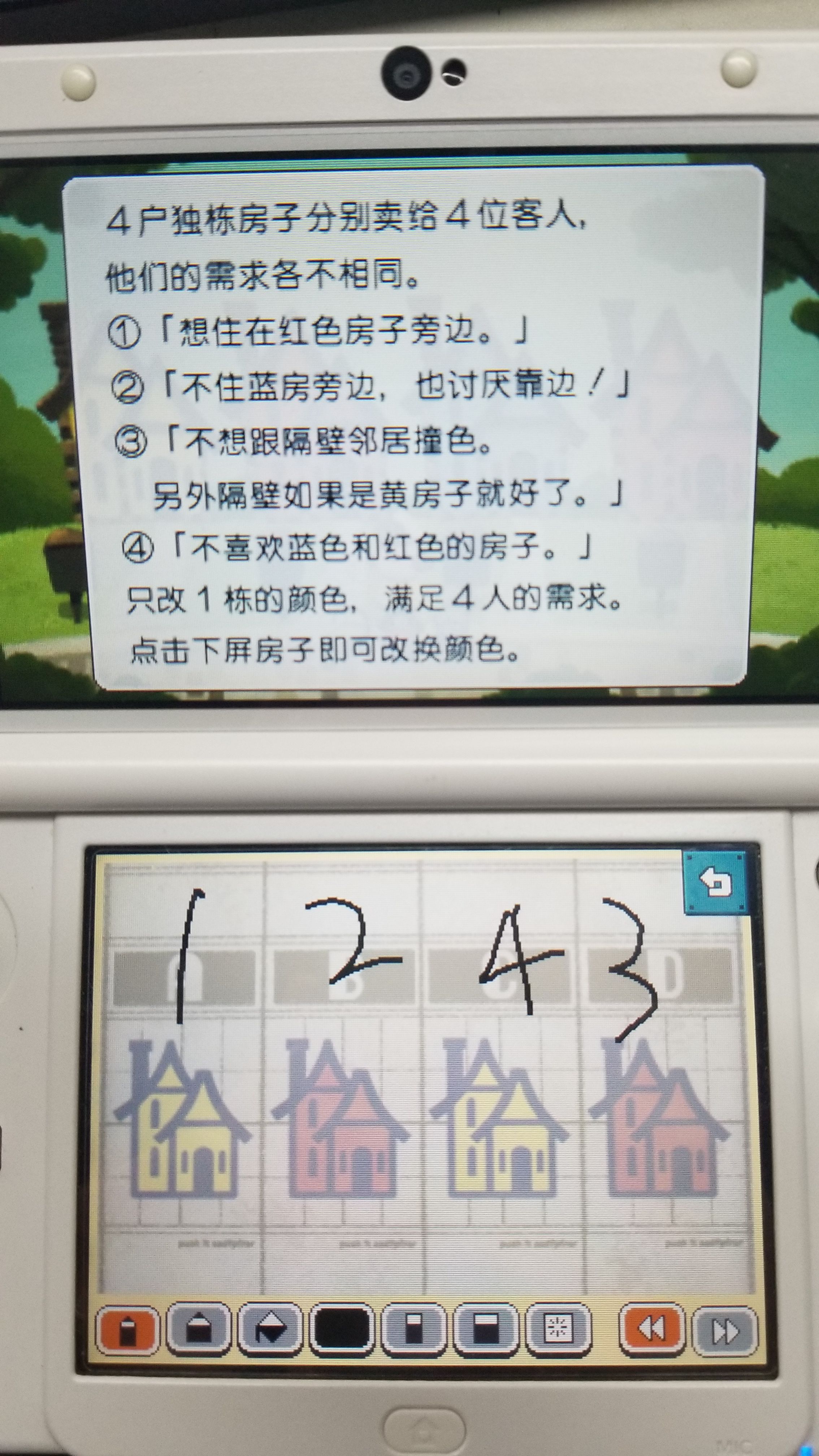 迷面如下,我的答案如图,是将C房改成黄色,也是满足了4个人的要求,题目没有要求一定要有蓝色吧,这道题是不是有不严谨的问题呢