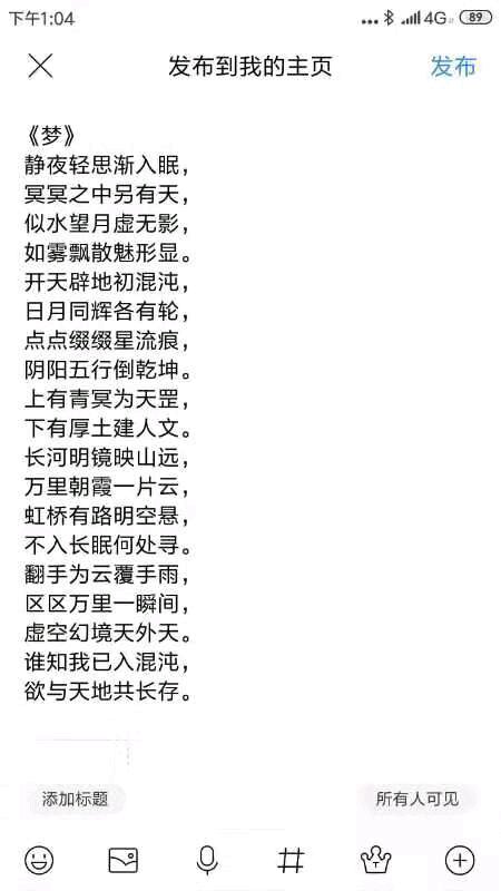 《梦》静夜轻思渐入眠,冥冥之中另有天,似水望月虚无影,如雾飘