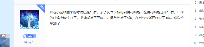 刚看到一张贴 吧友算了下年龄 出入不大 https://tieba.baidu.com/p/6197404669 近期的描述语: 1.少年飞奔躲避那根行山杖,大袖飘摇若飞雪,大声嚷嚷道:“就要见到我的先生你的师父了,开心不开心?!”
