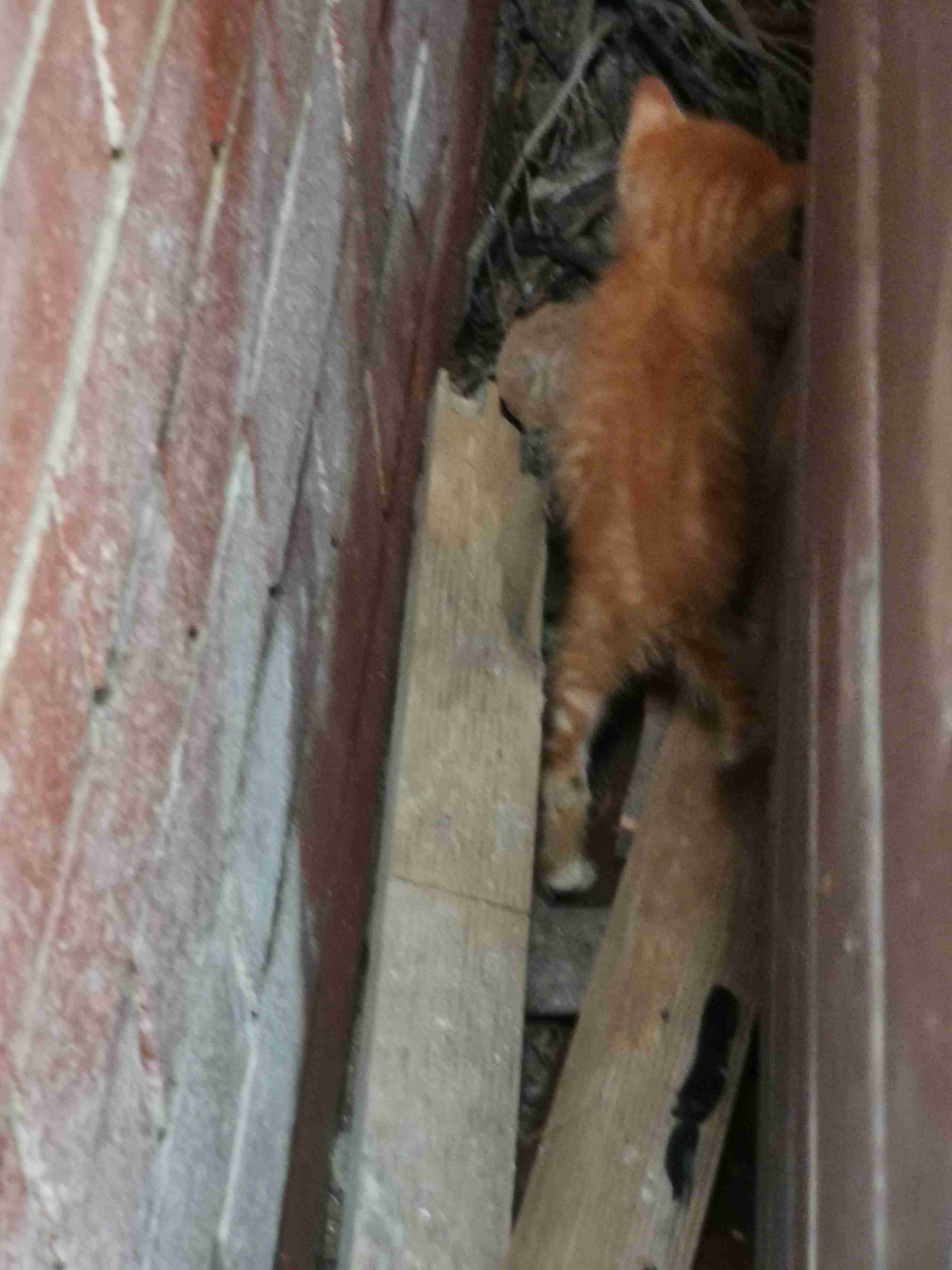 别墅地下车库发现一黄色小猫仔,躲在木栅栏内,不停的叫唤,看了