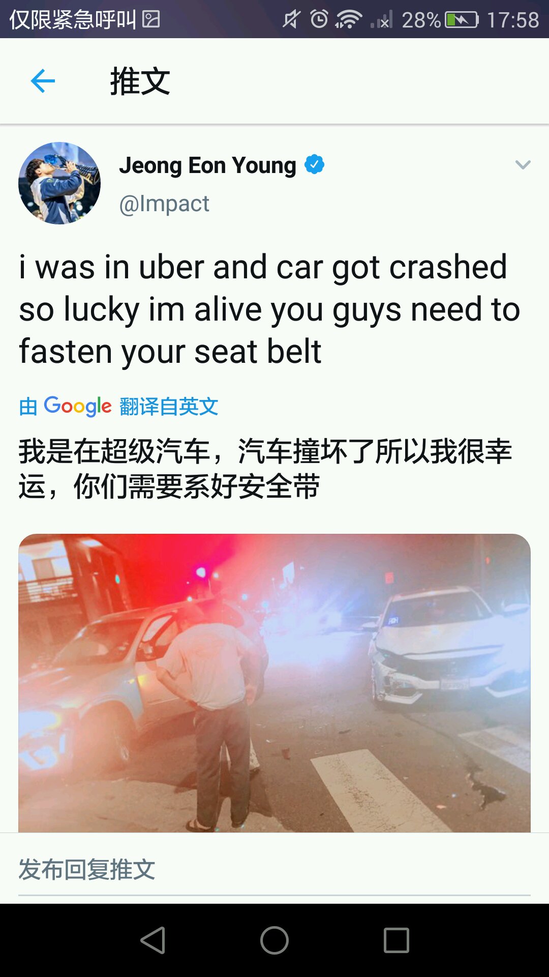 我坐uber(外国的打车)出车祸了 幸运的是我没事 你们要系好安全带啊