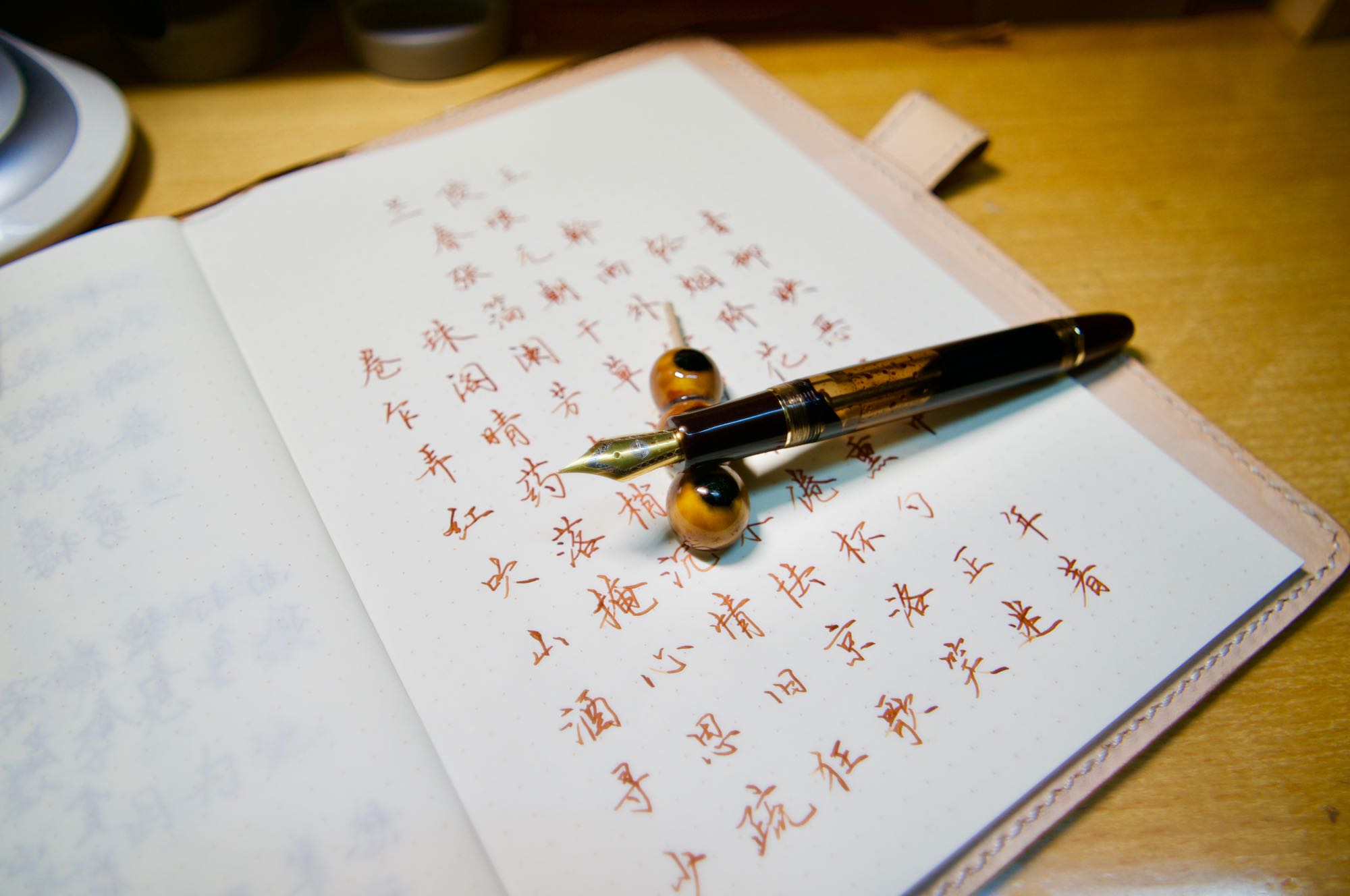 笔尖应该是圆头的,不容易出锋,钢尖就会偏硬了一些,也会劈叉,就是要比较用力一些,我用了辉柏嘉的墨水,还是很顺滑的,但不知道为啥我这把写快点有点飞白。