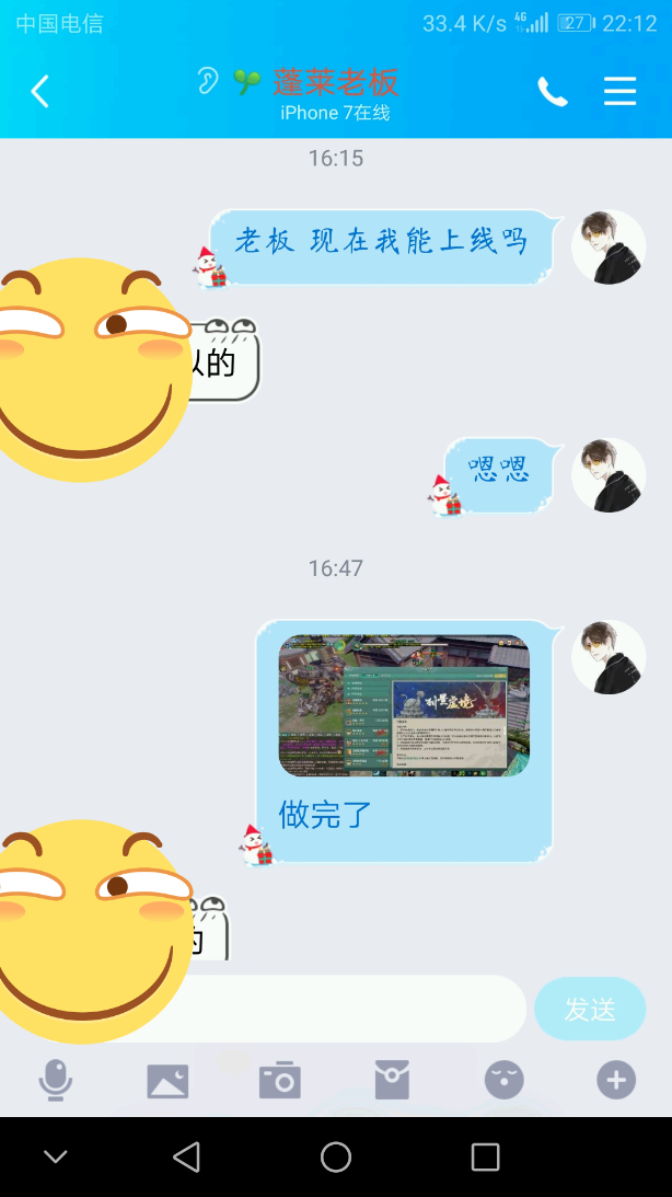 我 上线会问 做完截图 我可以给你发我问老板上线的聊天截图