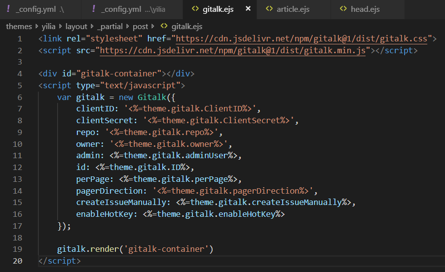 2.在主题的layout\_partial\post 里面创建了一个gitalk.ejs文件: