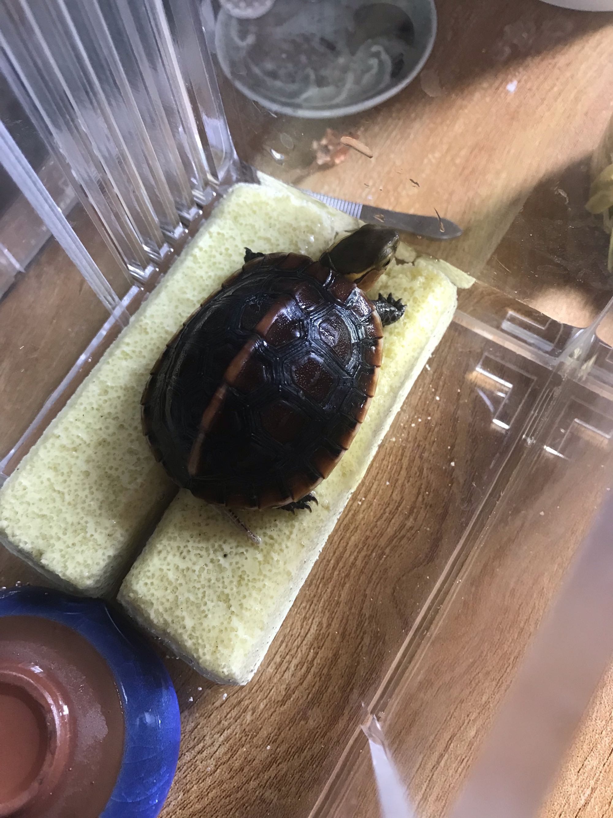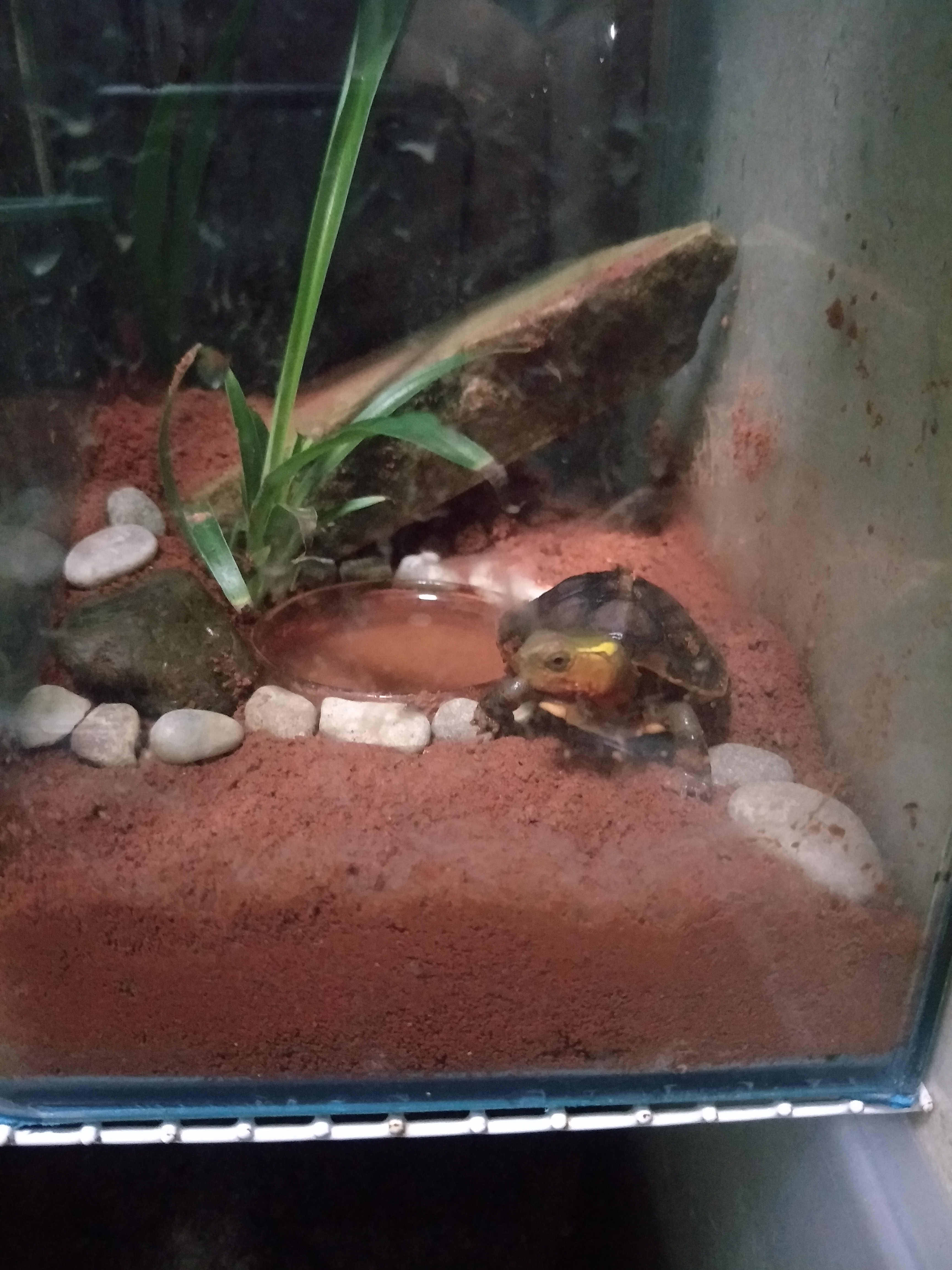 专门有个40×40的箱子,这是泡澡吃饭的,以前斗鱼用的排缸。刚到,在里面养两天,免得钻土。