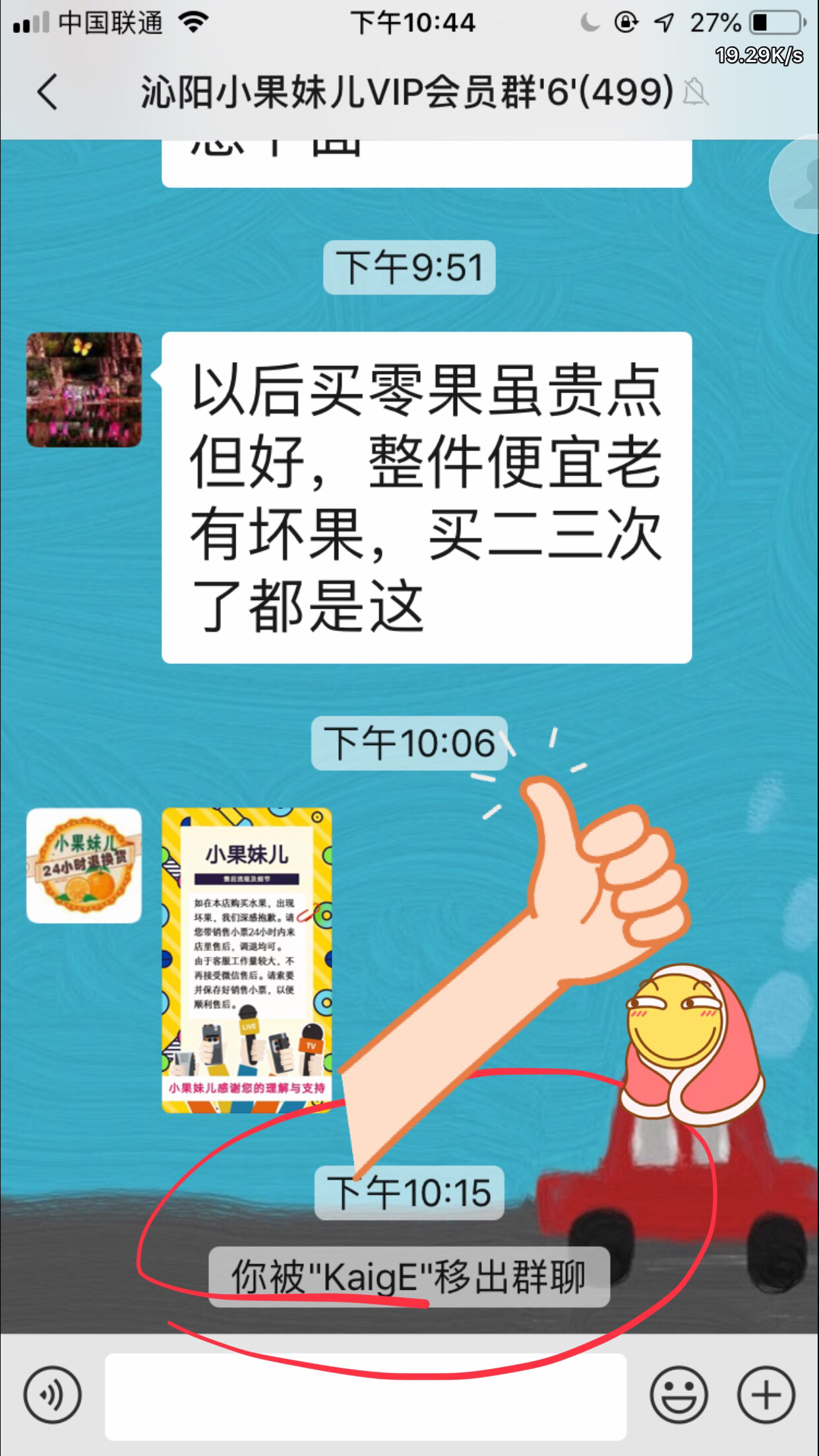 然后,小果妹儿的老板,我不知道你是不是在店里,你家服务员的态度,那真是顾客欠他们百八十万似的,真是可以,这服务态度,够厉害,去你家买个东西好像是求着去你家也是,买个搞活动的东西,你要是搞不起你就别搞,买个水果,你说让发朋友圈享受活动价,我说那你说多少钱,我直接付给你,不用活动价,服务员说不行,必须发朋友圈,那好,发过朋友圈之后你说等半个小时以后才可以,我忍了,但是在我前面哪个,发个朋友圈不用等直接就买了,问服务员,服务员直接说,人家是老板的朋友,呵,那不要行了吧,服务员说,不行,已经出过单了。