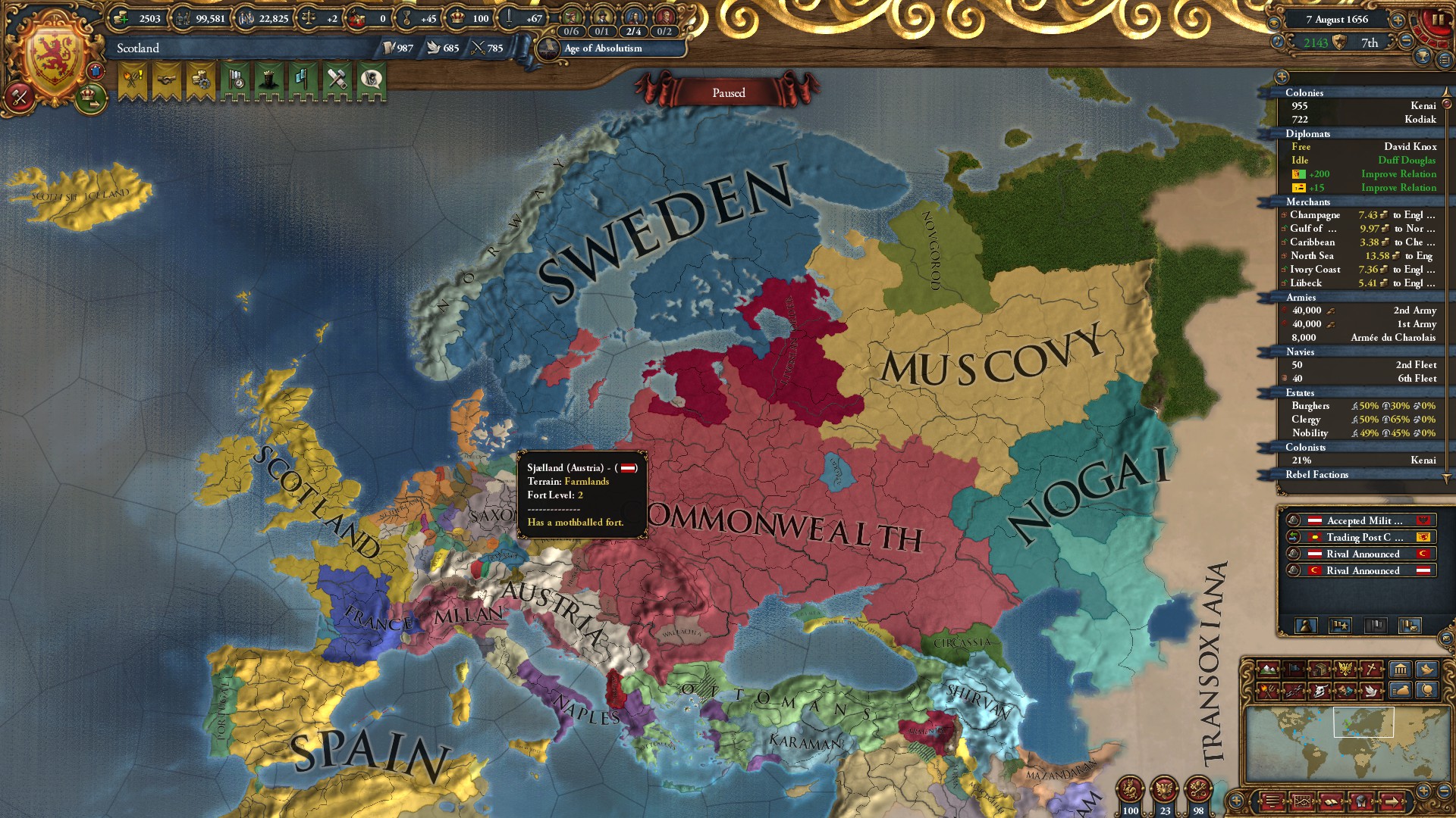 然后玻璃成为地区霸主,彻底压制住毛子的发展,虽然丹麦最终由于丢了瑞典老婆和叛乱问题失去了诺夫的地,但毛子也没能吃到。