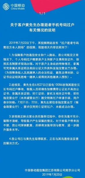 7月23日下午消息,今日一段“过户逝者号码需双方本人到场”的视频引发网友热议。对此,中国移动通信集团江苏有限公司南京分公司回应称,当事人前往的是非指定营业厅,导致办理失败,其对营业员沟通不充分、解释不清晰表示歉意。