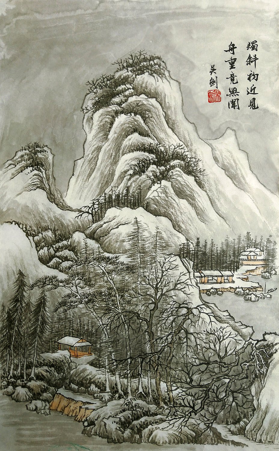 雪景大面积渲染要先将纸打湿,然后再染,等快干了再染,如此反复几遍,注意要把墨色调淡一些,