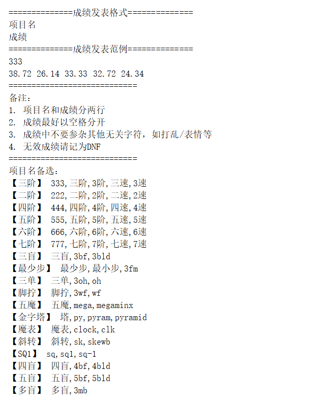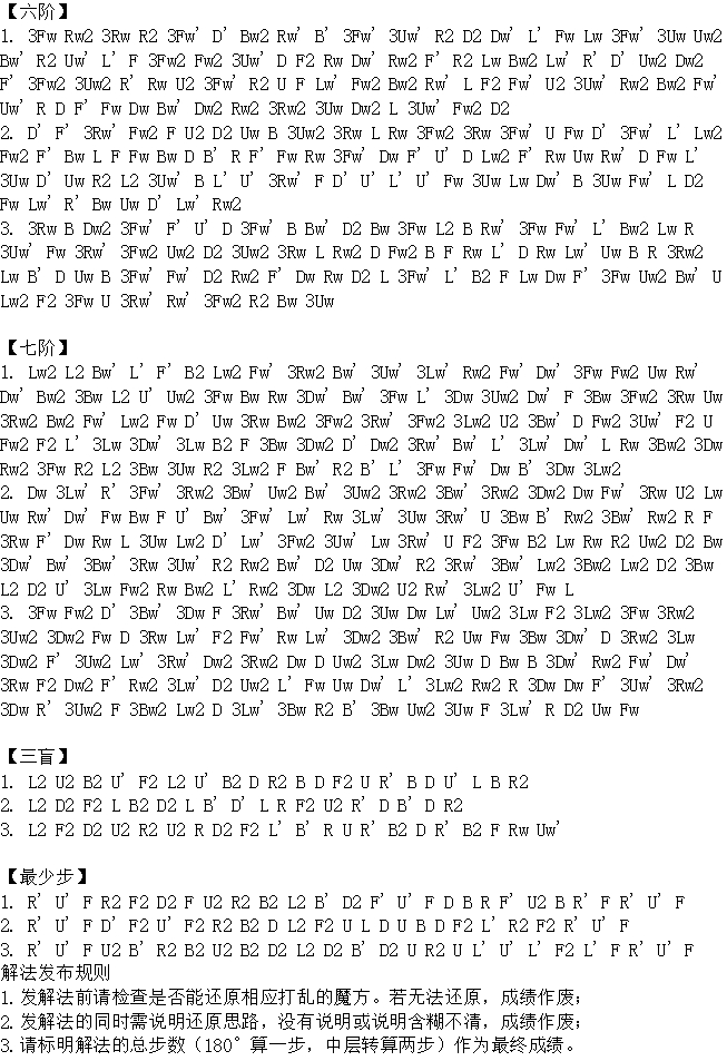 2.采用WCA规则,所有打乱一次尝试机会,请自觉遵守。成绩时间至少精确到0.01秒,计时器不限。