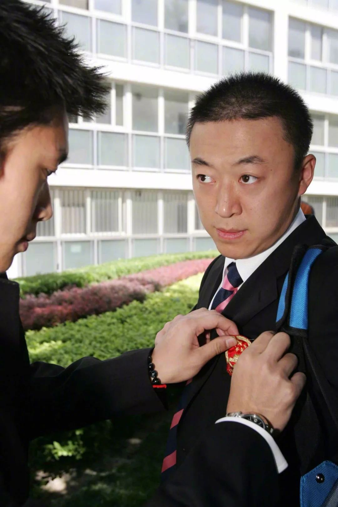△ 2007年,中国乒乓球队即将启程,参加乒乓球世锦赛,工作人员为马琳佩戴国徽。