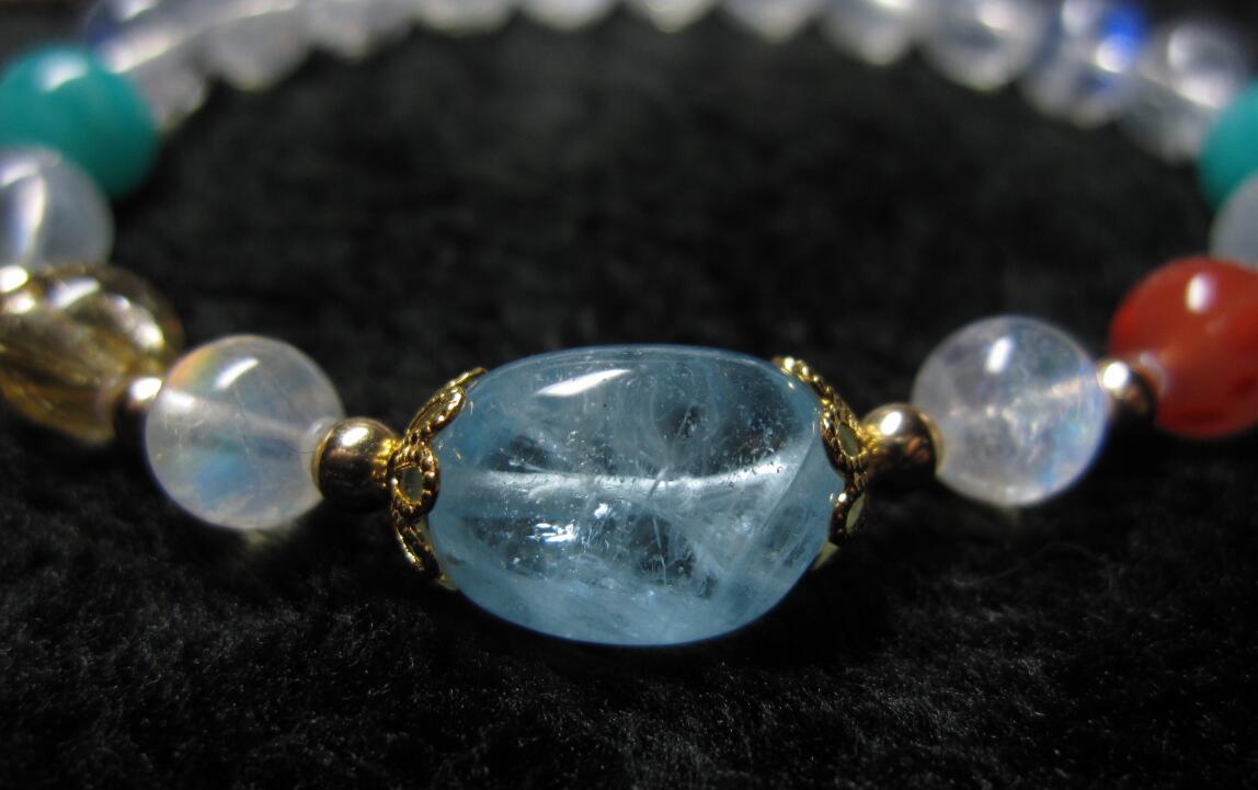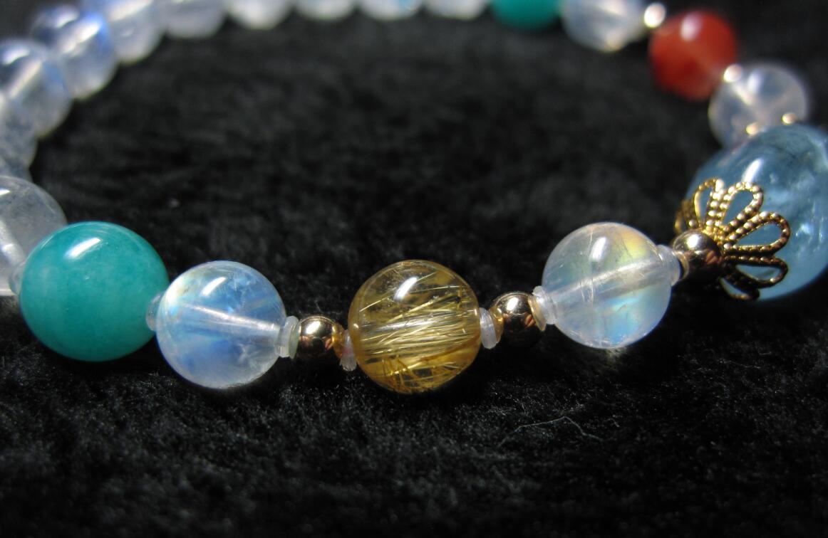 彩月+蓝月6.5MM,马粉10MM,天河石7.5MM,花花11.2MM,金发晶和南红是6.8MM,大海蓝是12.5×9.3左右,还有小葡萄石隔珠和青金石,