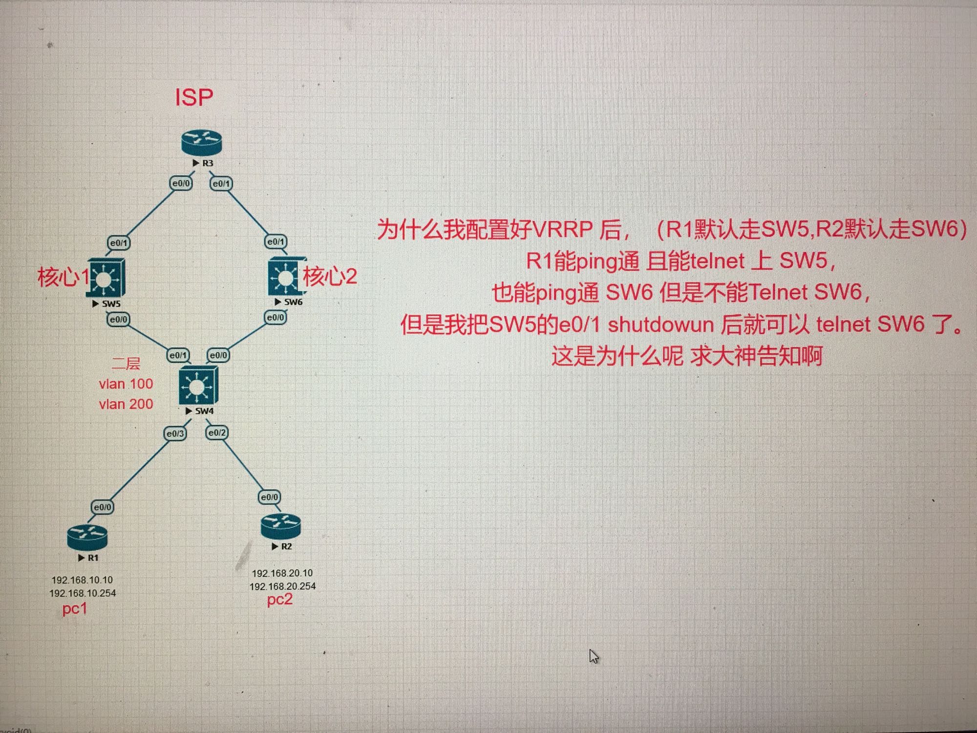 自学的na,vlan. truck. Vtp Stp Acl Dhcp Ospf 什么的技术点都已经掌握跟了解原理,且能够熟练的配置设备。就是到了vrrp这里卡住了。下边有图,求大神指点一下