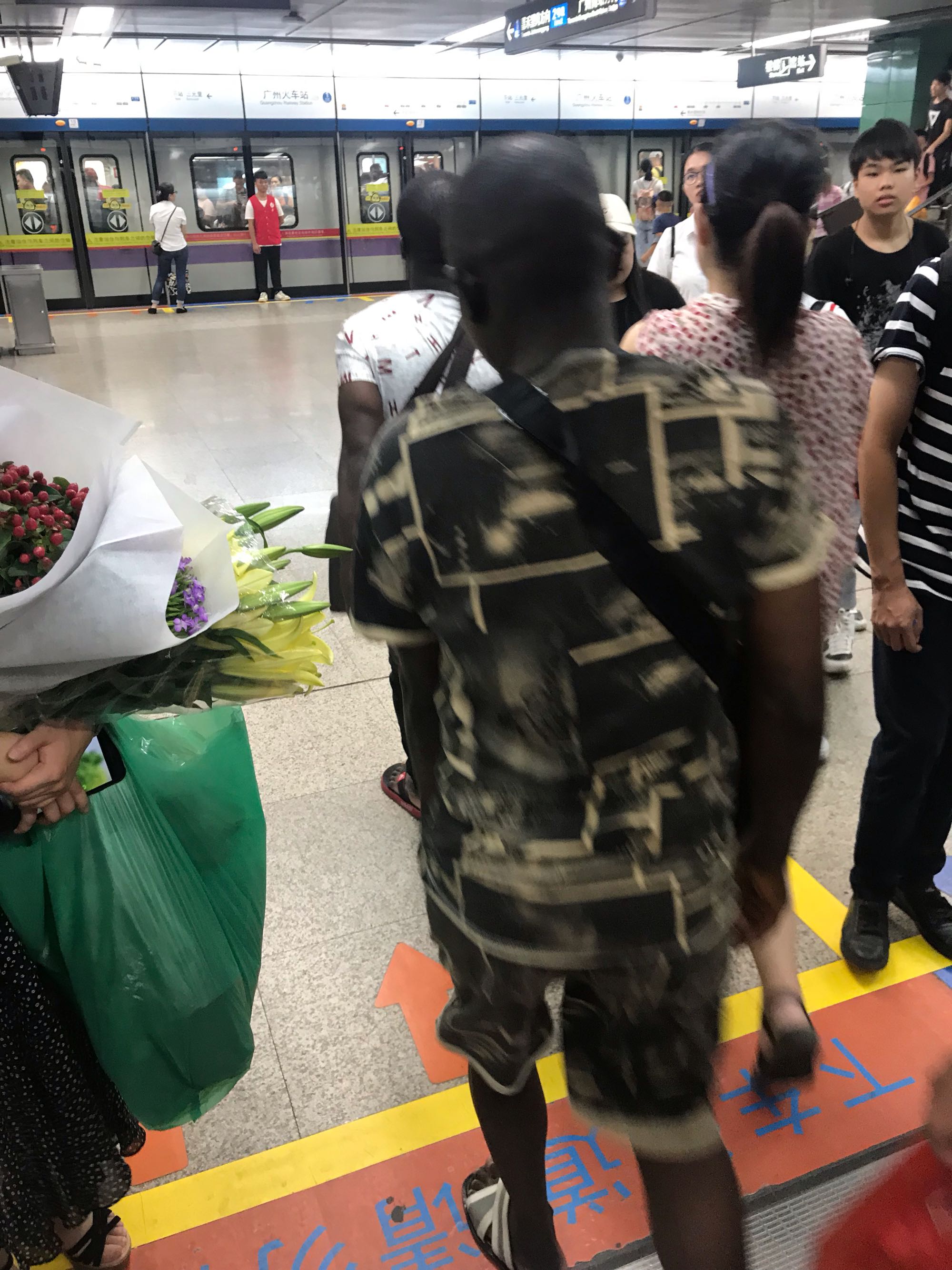 今天我坐飞机到广州白云机场,之后乘地铁到广州南站。先从机场南乘3号线到嘉禾望岗,再乘2号线到广州南站。2号线途中有个三元里站和广州火车站,三元里站上了俩黑人,身上味道很大,旁边人都下意识地和它们拉开距离,只乘了一站,在广州火车站下。因为不想起冲突,我只在它们下车后拍了张照。就乘这么一次地铁都让我碰上了,基数怕是不小。