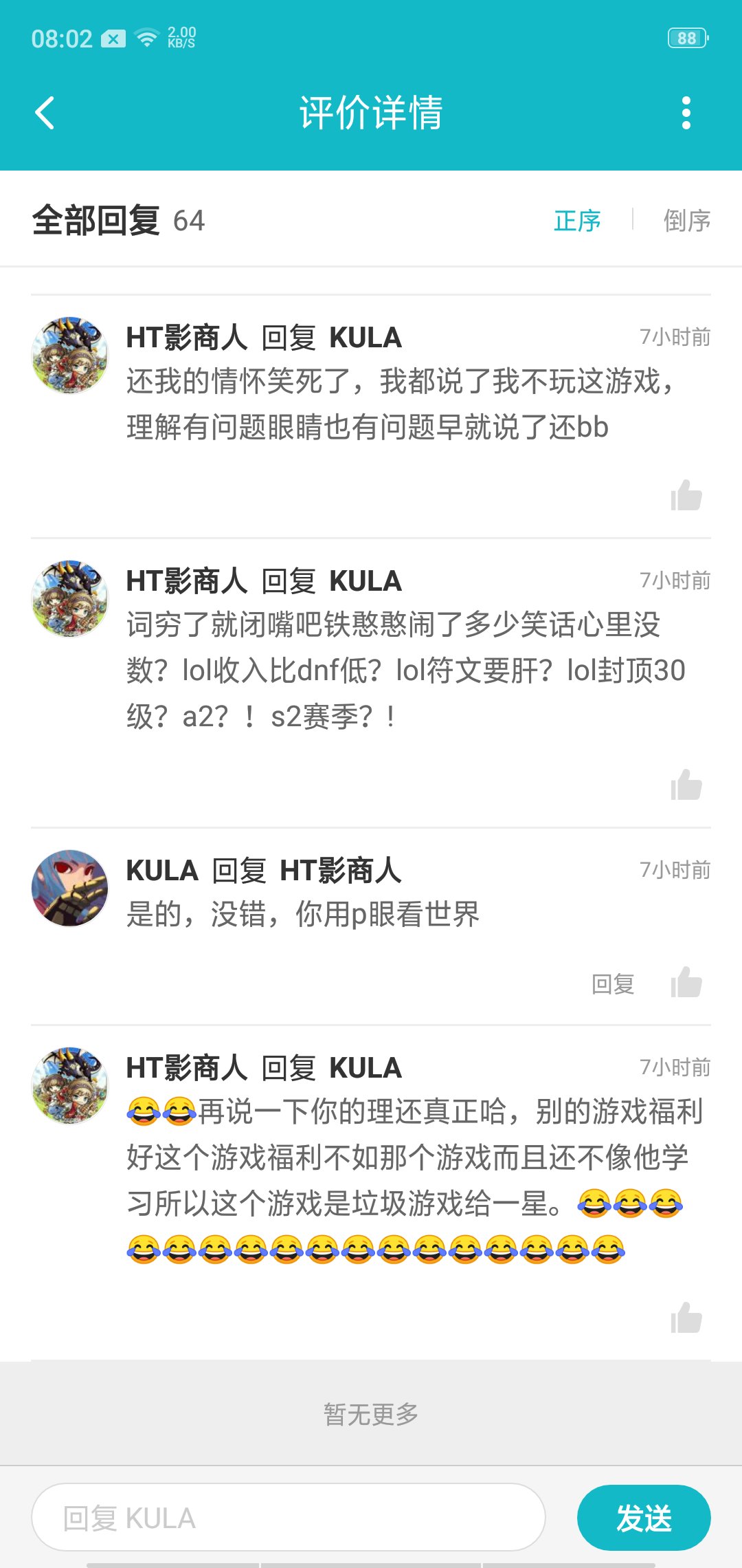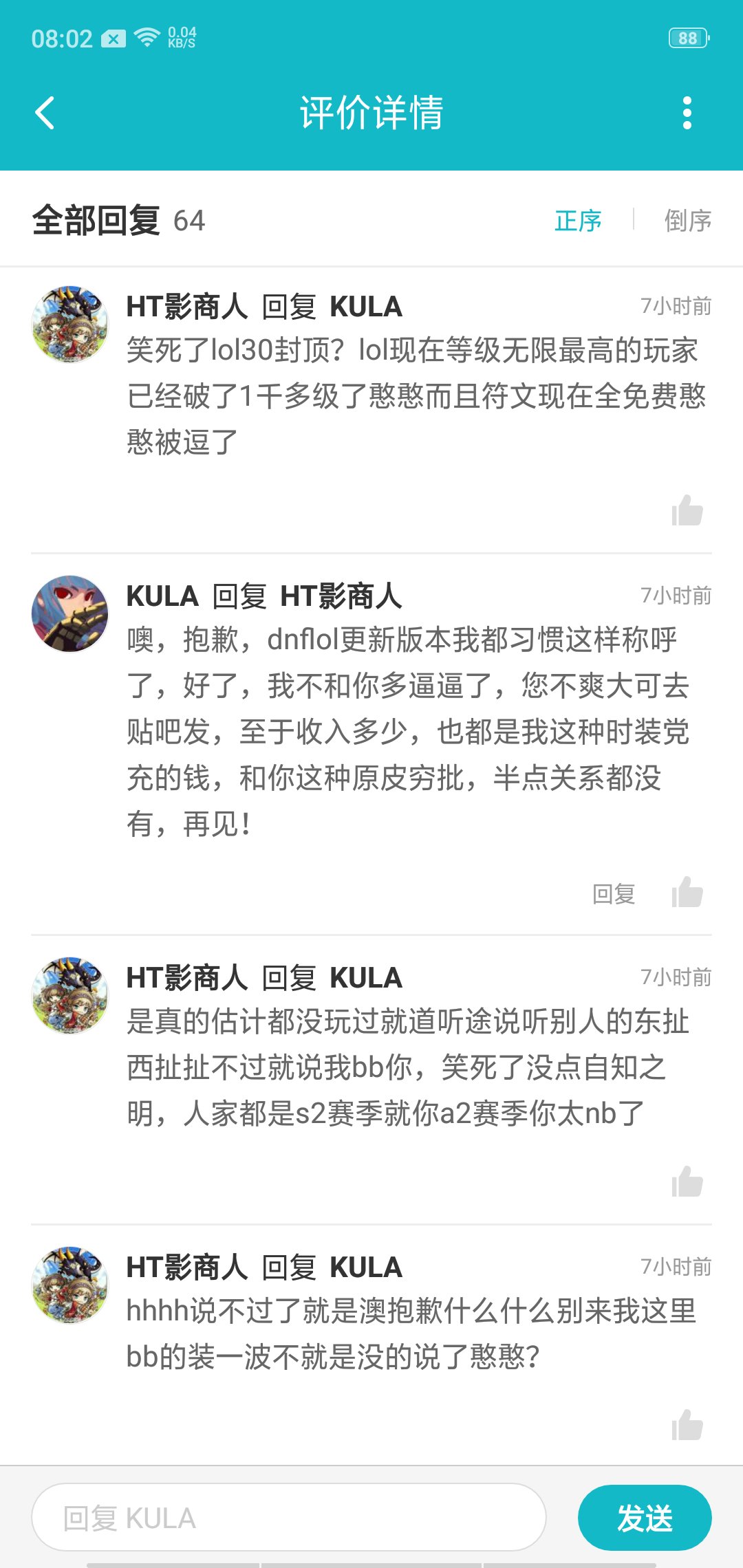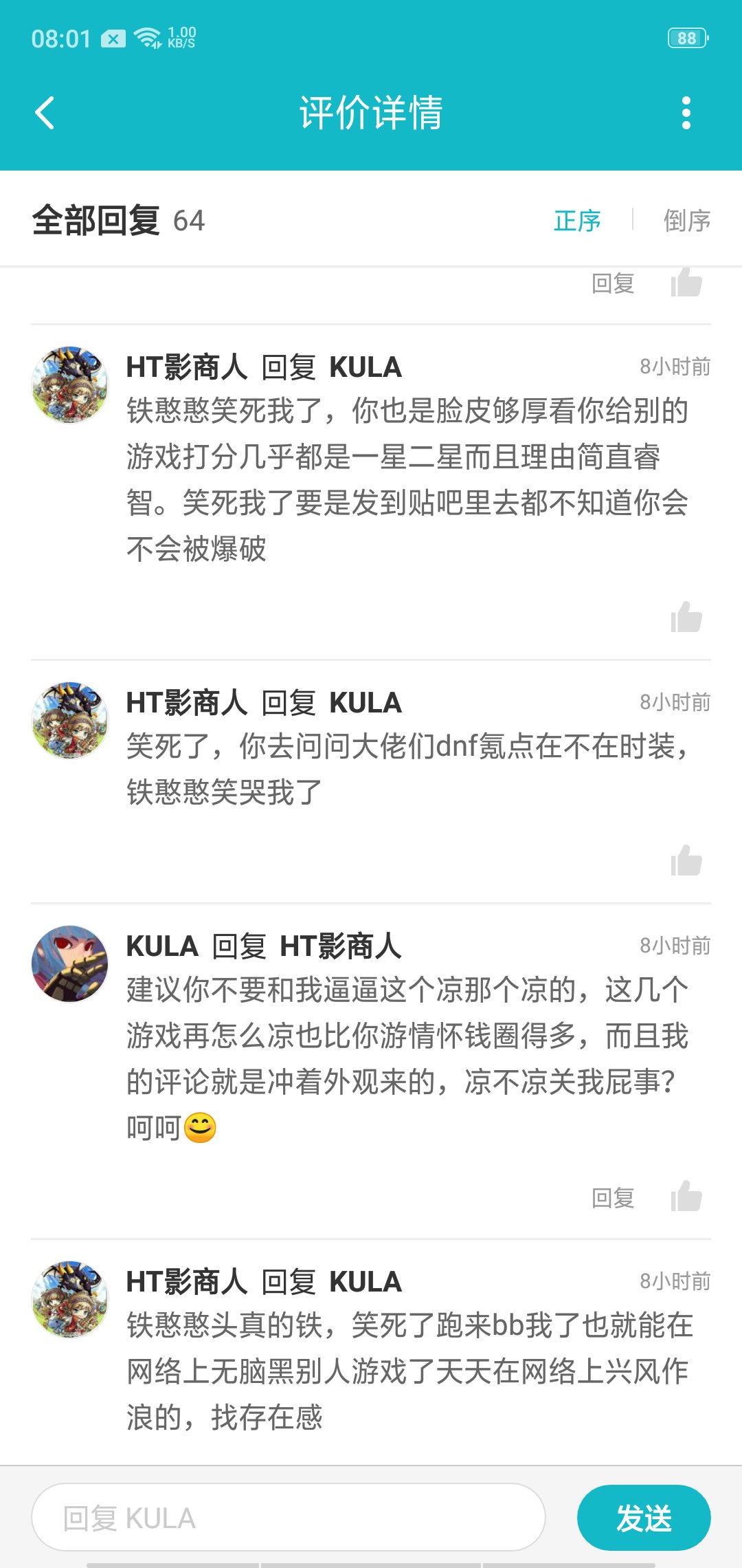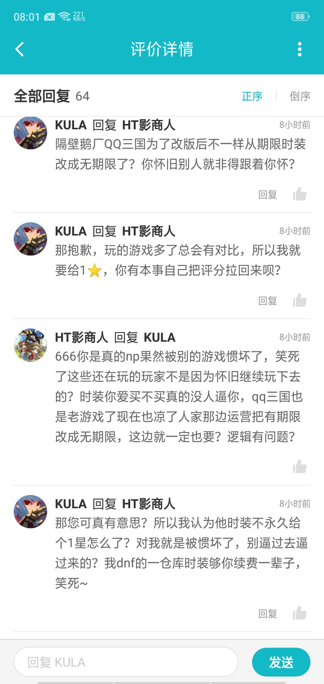 是真的讨厌,居然好像还很自豪一样,后面自己在那扯说自己在鹅厂的DNF氪了很多时装钱没理说不过一直***批什么的,我也是服了凭什么在倩女幽魂论坛发怀旧的那些老玩家就成了他口中的故意刷的。凭什么倩女时装有期限就是垃圾游戏了?这个铁憨憨没理鬼扯后面都被我拆穿了。