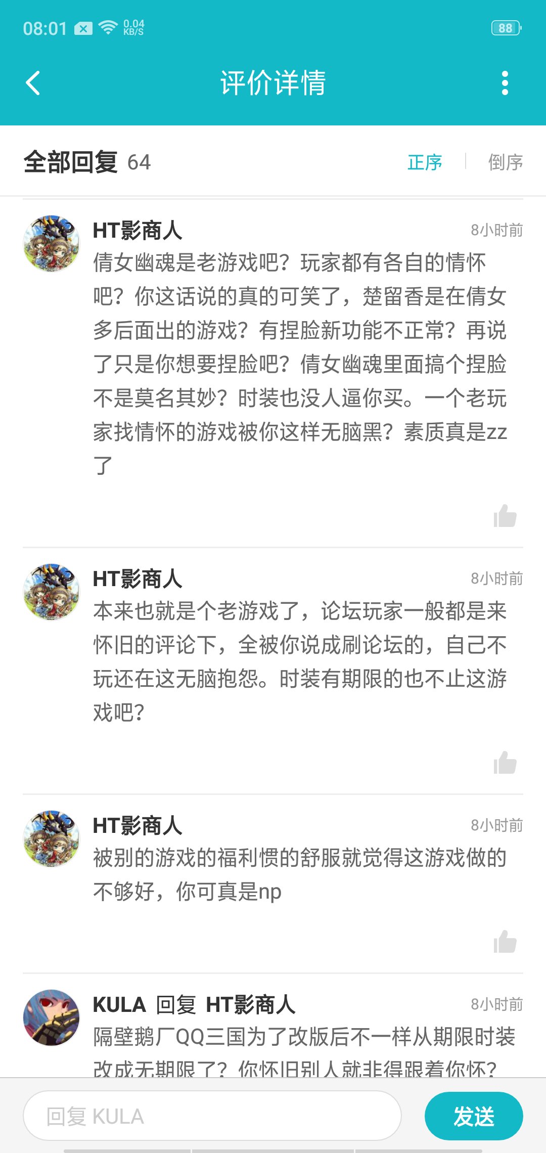 昨天晚上去taptap想下载倩女幽魂入坑的,知道这是个老情怀游戏了,结果在下面论坛遇到了个铁憨憨属实恶心人,总结一下就是自己喜欢玩装扮,隔壁鹅厂qq三国把时装改成无期限的了就来喷倩女幽魂这种老情怀游戏垃圾无脑打一星,别的游戏福利多这个游戏福利少,还不向福利多的那个学习所以这个游戏是垃圾游戏无脑黑打一星。