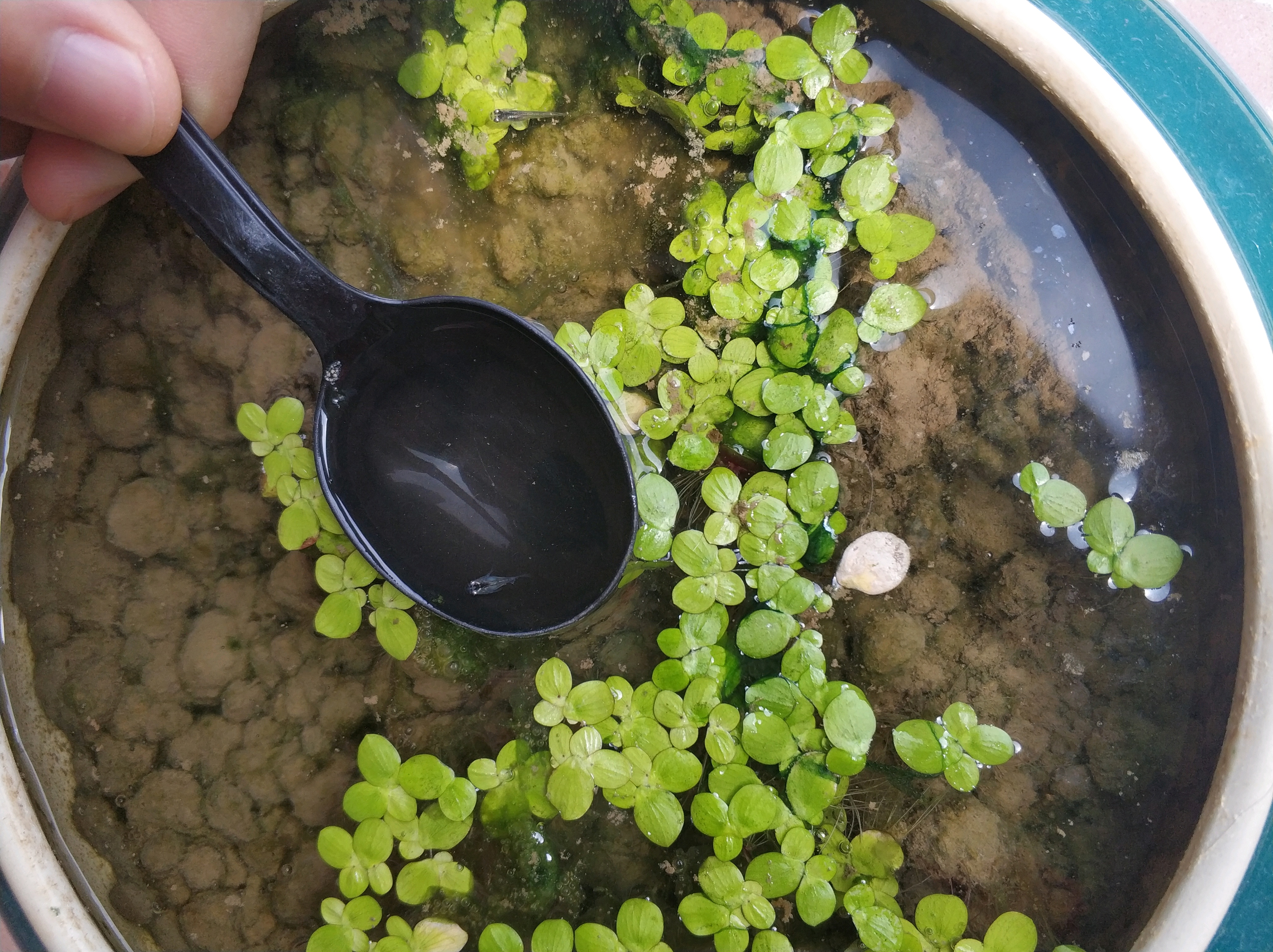 球体吗 我之前以为是个尾巴被咬掉的 刚才突发奇想捞出来看看 居然有尾巴 和同期的鱼对比 就它身子短 出生18天 之前放碗莲盆里室外放着的
