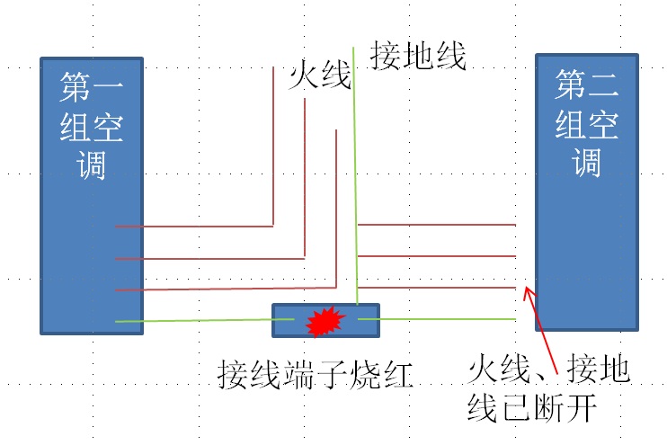 请教老师们,两组三相空调,每组三根火线,一根接地线,第一组工作正常,第二组大修,且第二组的火线、接地线已断开,当第二组的接地线接到端子上时,3、4分钟时间端子就会烧红,什么原因?
