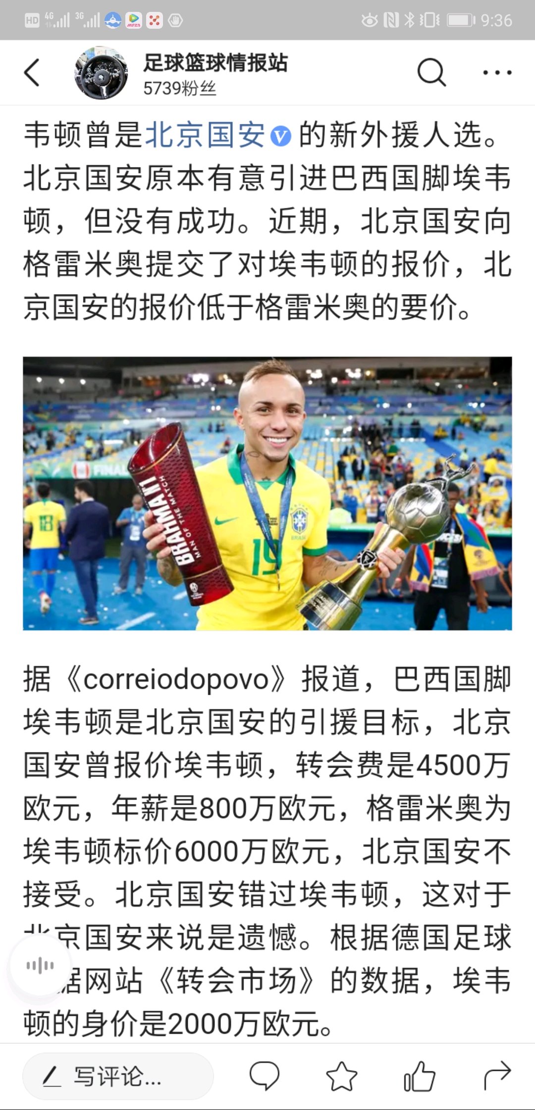 中超和归划已经把巴西人的价码炒高了