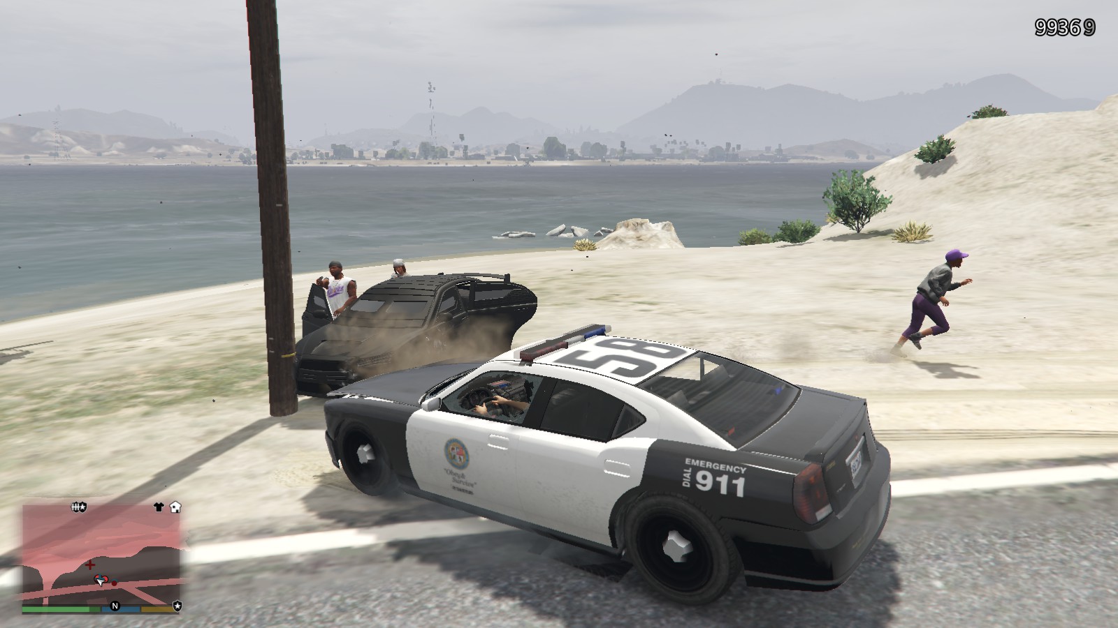 关键车技还是得靠我,成功让他们撞到的电线杆,引擎熄火了。兄弟们上啊,开始实施抓捕行动。就在我们扣押另外3个的时候,居然没注意驾驶室那个没下车。让他又发动了车子,跑了。