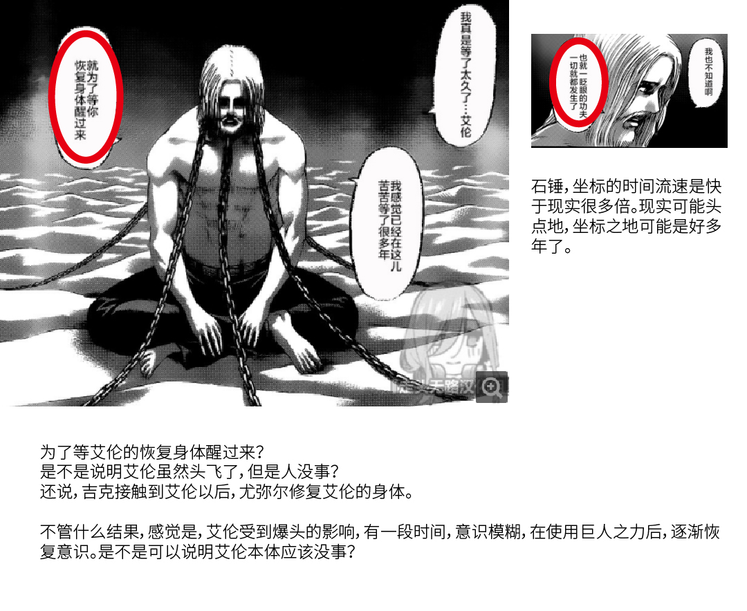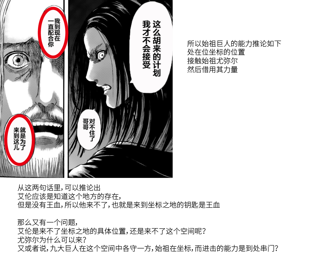 当格里沙说出吉克对不起,只有吉克表示出震惊,可能这句话是一开始艾伦掌握始祖力给吉克造成的假象(也符合之前所谓“作画失误”),说一声吉克时艾伦才表示震惊,可能在这时艾伦根据格里沙还是有想着吉克和以前的教训,考虑接下来的回忆应该更有能力感化吉克,就变化为艾伦主动说下一段记忆吧